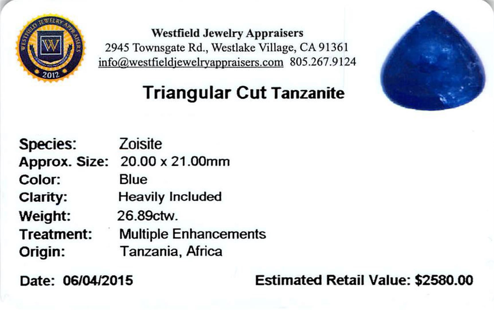 One triangle cabochon cut natural tanzanite, measuring 20.00 x 21.00 x 7.00mm, exact weight 26.89ct., clarity is heavily included, type I, dark, very slightly grayish, blue color, (GIA B 7/3), cut is good. Transmitting light somewhat diffusely, transparent to translucent. Naturally occurring internal & external characteristics are present. Indications of heat treatment. Westfield Appraised at $2,580.00.