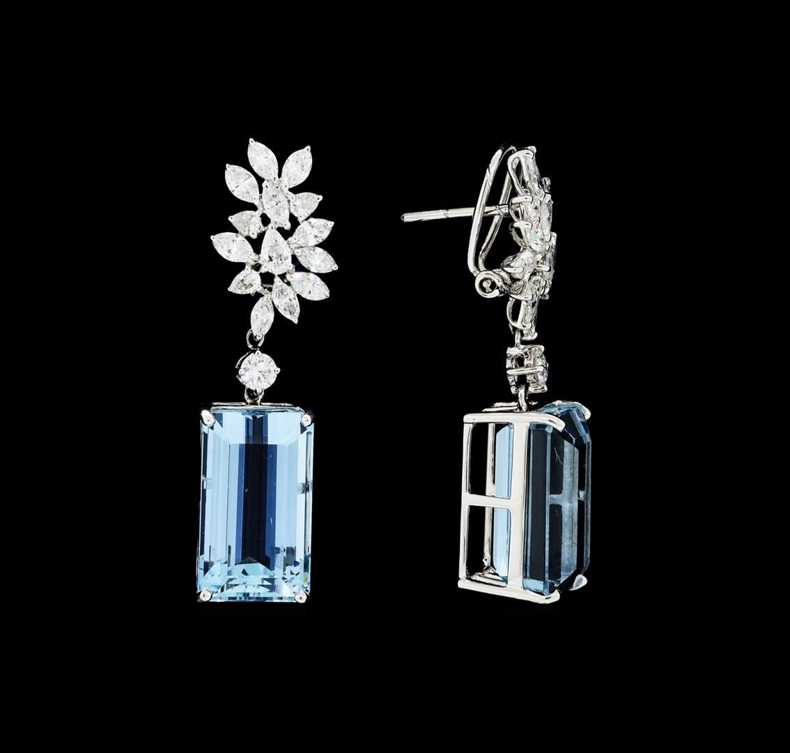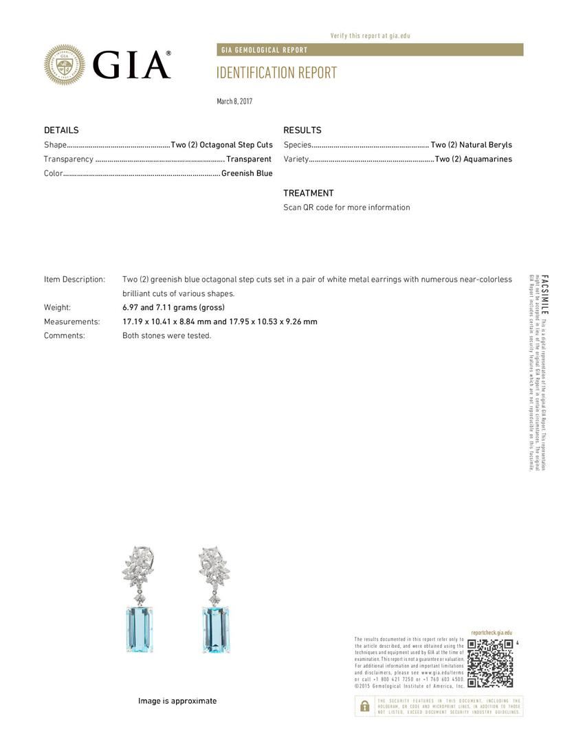 One pair electronically tested 18KT white gold lady's combination cast & assembled fashion earrings with Omega clip backs with posts with a bright polish finish. The featured lady's earrings have both Omega clip backs with posts and heavy friction backings. Identified with markings of '18K'. Condition is new, good workmanship. Containing: One prong set emerald standard step cut natural aquamarine, measuring 17.95 x 10.53 x 9.26mm, (depth est.) 15%. bulge factor, approximate total weight of 15.10ct., clarity is eye clean, medium light, moderately strong, greenish blue color, (GIA gB 4/4), cut is very good. Transmitting light with no distortion, transparent. Colored gemstones are presumed to have been subjected to commonly used enhancement processes. Graded in the setting in the GIA Laboratory, Report #2183196260. Two prong set round brilliant cut diamonds, measuring 3.50 - 3.45 x 2.16mm (depth est.) approximate total weight of 2 Stones = 0.32ct. Graded in the setting. Color H Clarity VS-2 to SI-1 Cut Very Good Eight prong set pear shaped cut diamonds, measuring 4.60 x 2.80 x 1.77mm (depth est.) approximate total weight of 8 Stones = 1.08ct. Graded in the setting. Color H - I Clarity SI-1 to SI-2 Cut Good Twenty prong set marquise shaped cut diamonds, measuring 4.20 x 2.10 x 1.32mm (depth est.) approximate total weight of 20 Stones = 1.35ct. Graded in the setting. Color H - I Clarity SI-1 to SI-2 Cut Good One prong set emerald standard step cut natural aquamarine, measuring 17.19 x 10.41 x 8.84mm, (depth est.) 12%. bulge factor, approximate weight of 13.17ct., clarity is eye clean, medium light, moderately strong, greenish blue color, (GIA gB 4/4), cut is very good. Transmitting light with no distortion, transparent. Colored gemstones are presumed to have been subjected to commonly used enhancement processes. Graded in the setting in the GIA Laboratory, Report #2183196260. Total Weight of Colored Stones 28.27ct.. Total Weight of Diamonds 2.75ct.. Total Weight of Earrings 14.10gm GAS Appraised at $51915.00. GAS Appraised at $51,915.00.