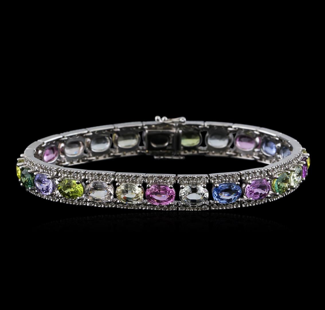 One electronically tested 18KT white gold lady's combination cast & assembled fashion bracelet with a tongue clasp with foldover safety with a bright polish finish. The featured lady's bracelet measures approximately 7.25 inches in length. Trademark is Dyach. Identified with markings of "18K". Condition is new, good workmanship. Containing: Twenty-five prong set oval modified brilliant cut natural multi-color sapphires, measuring 7.10 x 5.05 x 3.28mm, 14%. bulge factor, approximate total weight of 28.38ct., clarity is eye clean, cut is very good. The featured sapphires range in color from blue to green to yellowish green to yellow to pink to purple to white. Transmitting light with no distortion, transparent. Colored gemstones are presumed to have been subjected to commonly used enhancement processes. Graded in the setting. Two Hundred prong set round brilliant cut diamonds, measuring 1.40 - 1.30 x 0.81mm (depth est.) approximate total weight of 200 Stones = 1.75ct. Graded in the setting. Clarity: SI-2 to I-1. Color: G - Good. Total Weight of Colored Stones 28.38ct. Total Weight of Diamonds 1.75ct. Total Weight of Bracelet 30.20gm GAS Appraised at $14,890.00.