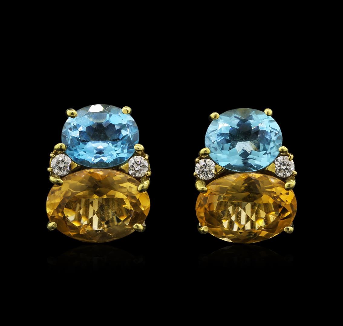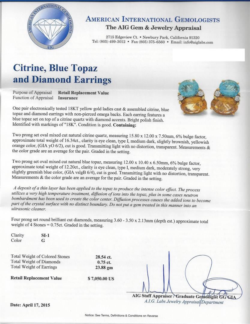 One pair electronically tested 18KT yellow gold ladies cast & assembled citrine, blue topaz and diamond earrings with non-pierced omega backs. Each earring features a blue topaz set on top of a citrine quartz with diamond accents. Bright polish finish. Identified with markings of "18K". Condition is good. Containing: Two prong set oval mixed cut natural citrine quartz, measuring 15.80 x 12.00 x 7.50mm, 6% bulge factor, approximate total weight of 16.34ct., clarity is eye clean, type I, medium dark, slightly brownish, yellowish orange color, (GIA yO 6/2), cut is good. Transmitting light with no distortion, transparent. Measurements & the color grade are an average for the pair. Graded in the setting. Two prong set oval mixed cut natural blue topaz, measuring 12.00 x 10.40 x 6.50mm, 6% bulge factor, approximate total weight of 12.20ct., clarity is eye clean, type I, medium dark, moderately strong, very slightly greenish blue color, (GIA vslgB 6/4), cut is good. Transmitting light with no distortion, transparent. Measurements & the color grade are an average for the pair. Graded in the setting. A deposit of a thin layer has been applied to the topaz to produce the intense color effect. The process utilizes a very high temperature treatment, diffusion of ions into the topaz, plus in some cases neutron bombardment has been used to create the color center. Diffusion processes causes the added ions to become part of the crystal surface with no distinct boundary. Do not put a gem treated in this manner into an ultrasonic cleaner. Four prong set round brilliant cut diamonds, measuring 3.60 - 3.50 x 2.13mm (depth est.) approximate total weight of 4 Stones = 0.75ct. Graded in the setting. Clarity: SI-1. Color: G. Total Weight of Colored Stones: 28.54 ct. Total Weight of Diamonds: 0.75 ct. Total Weight of Earrings: 23.88 gm. AIG Appraised at $7,050.00.