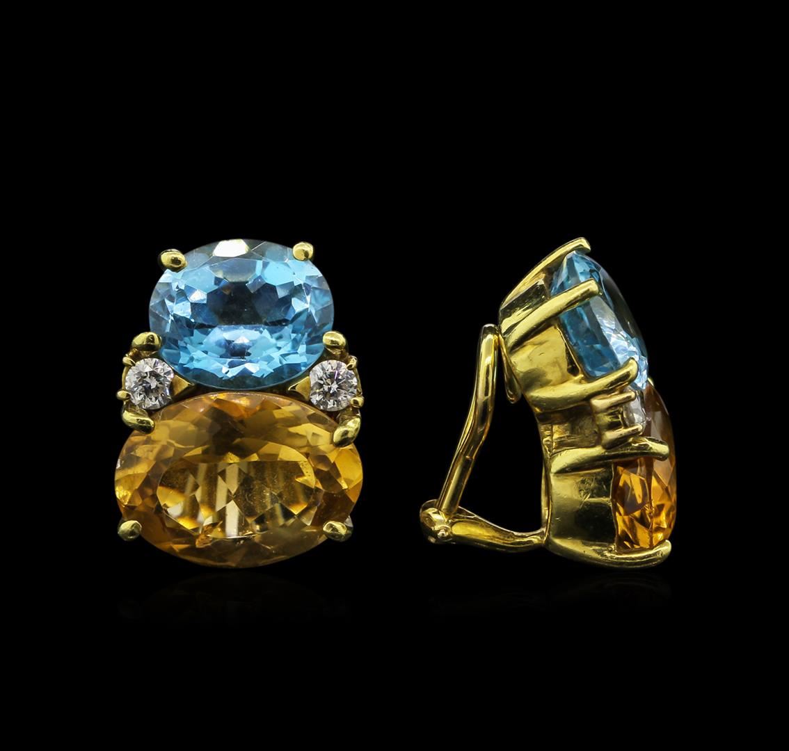 One pair electronically tested 18KT yellow gold ladies cast & assembled citrine, blue topaz and diamond earrings with non-pierced omega backs. Each earring features a blue topaz set on top of a citrine quartz with diamond accents. Bright polish finish. Identified with markings of "18K". Condition is good. Containing: Two prong set oval mixed cut natural citrine quartz, measuring 15.80 x 12.00 x 7.50mm, 6% bulge factor, approximate total weight of 16.34ct., clarity is eye clean, type I, medium dark, slightly brownish, yellowish orange color, (GIA yO 6/2), cut is good. Transmitting light with no distortion, transparent. Measurements & the color grade are an average for the pair. Graded in the setting. Two prong set oval mixed cut natural blue topaz, measuring 12.00 x 10.40 x 6.50mm, 6% bulge factor, approximate total weight of 12.20ct., clarity is eye clean, type I, medium dark, moderately strong, very slightly greenish blue color, (GIA vslgB 6/4), cut is good. Transmitting light with no distortion, transparent. Measurements & the color grade are an average for the pair. Graded in the setting. A deposit of a thin layer has been applied to the topaz to produce the intense color effect. The process utilizes a very high temperature treatment, diffusion of ions into the topaz, plus in some cases neutron bombardment has been used to create the color center. Diffusion processes causes the added ions to become part of the crystal surface with no distinct boundary. Do not put a gem treated in this manner into an ultrasonic cleaner. Four prong set round brilliant cut diamonds, measuring 3.60 - 3.50 x 2.13mm (depth est.) approximate total weight of 4 Stones = 0.75ct. Graded in the setting. Clarity: SI-1. Color: G. Total Weight of Colored Stones: 28.54 ct. Total Weight of Diamonds: 0.75 ct. Total Weight of Earrings: 23.88 gm. AIG Appraised at $7,050.00.