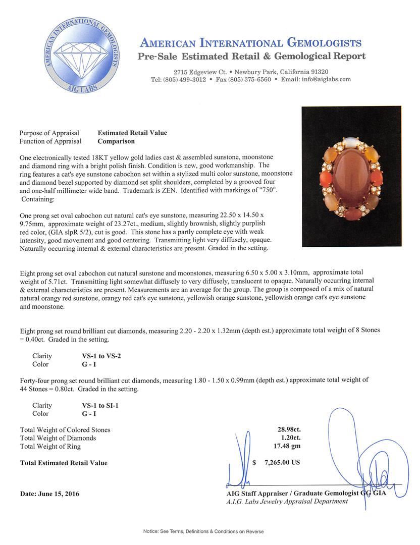 One electronically tested 18KT yellow gold ladies cast & assembled sunstone, moonstone and diamond ring with a bright polish finish. The ring features a cat's eye sunstone cabochon set within a stylized multi color sunstone, moonstone and diamond bezel supported by diamond set split shoulders, completed by a grooved four and one-half millimeter wide band. Trademark is ZEN. Identified with markings of "750". Condition is new, good workmanship. Containing: One prong set oval cabochon cut natural cat's eye sunstone, measuring 22.50 x 14.50 x 9.75mm, approximate weight of 23.27ct., medium, slightly brownish, slightly purplish red color, (GIA slpR 5/2), cut is good. This stone has a partly complete eye with weak intensity, good movement and good centering. Transmitting light very diffusely, opaque. Naturally occurring internal & external characteristics are present. Graded in the setting. Eight prong set oval cabochon cut natural sunstone and moonstones, measuring 6.50 x 5.00 x 3.10mm, approximate total weight of 5.71ct. Transmitting light somewhat diffusely to very diffusely, translucent to opaque. Naturally occurring internal & external characteristics are present. Measurements are an average for the group. The group is composed of a mix of natural natural orangy red sunstone, orangy red cat's eye sunstone, yellowish orange sunstone, yellowish orange cat's eye sunstone and moonstone. Eight prong set round brilliant cut diamonds, measuring 2.20 - 2.20 x 1.32mm (depth est.) approximate total weight of 8 Stones = 0.40ct. Graded in the setting. Clarity: VS-1 to VS-2. Color: G - I Forty-Four prong set round brilliant cut diamonds, measuring 1.80 - 1.50 x 0.99mm (depth est.) approximate total weight of 44 Stones = 0.80ct. Graded in the setting. Clarity: VS-1 to SI-1. Color: G - I. Total Weight of Colored Stones 28.98ct. Total Weight of Diamonds 1.20ct. Total Weight of Ring 17.48gm. AIG Appraised at $7,265.00.