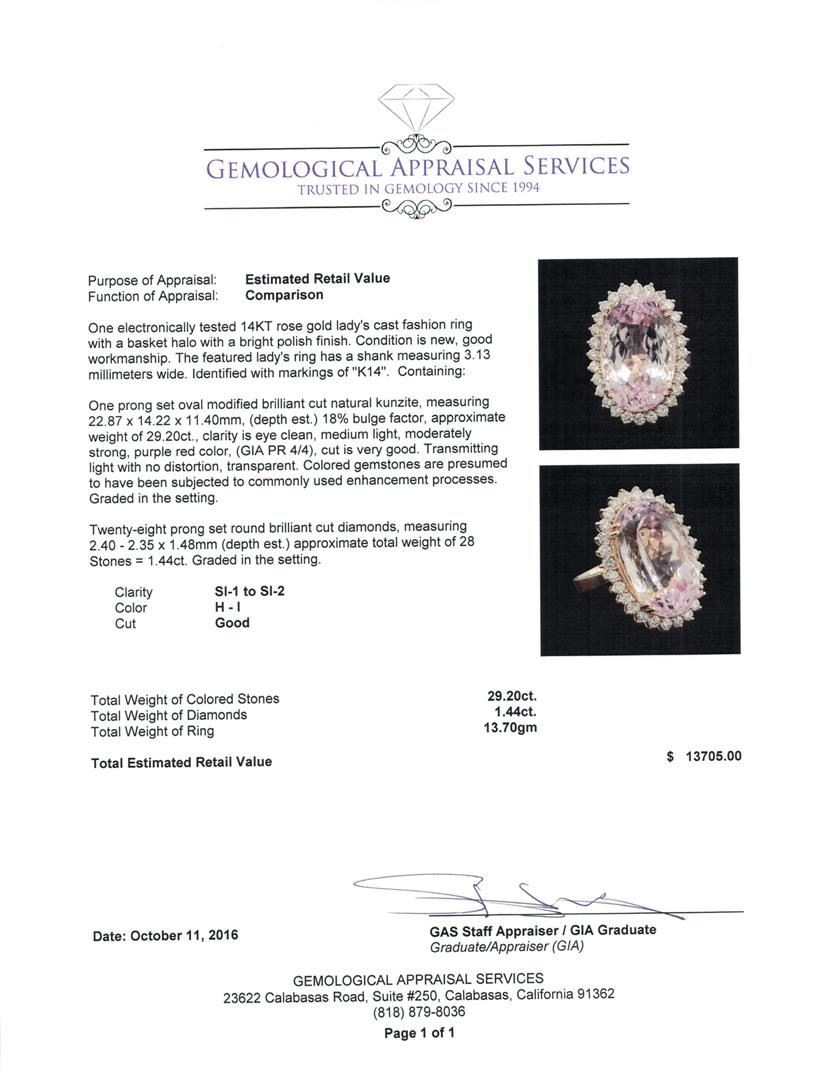 One electronically tested 14KT rose gold lady's cast fashion ring with a basket halo with a bright polish finish. The featured lady's ring has a shank measuring 3.13 millimeters wide. Identified with markings of 'K14'. Condition is new, good workmanship. Containing: One prong set oval modified brilliant cut natural kunzite, measuring 22.87 x 14.22 x 11.40mm, (depth est.) 18%. bulge factor, approximate weight of 29.20ct., clarity is eye clean, medium light, moderately strong, purple red color, (GIA PR 4/4), cut is very good. Transmitting light with no distortion, transparent. Colored gemstones are presumed to have been subjected to commonly used enhancement processes. Graded in the setting. Twenty-Eight prong set round brilliant cut diamonds, measuring 2.40 - 2.35 x 1.48mm (depth est.) approximate total weight of 28 Stones = 1.44ct. Graded in the setting. Clarity SI-1 to SI-2. Color: H - I Cut Good. Total Weight of Colored Stones 29.20ct.. Total Weight of Diamonds 1.44ct.. Total Weight of Ring 13.70gm. GAS Appraised at $13,705.00.