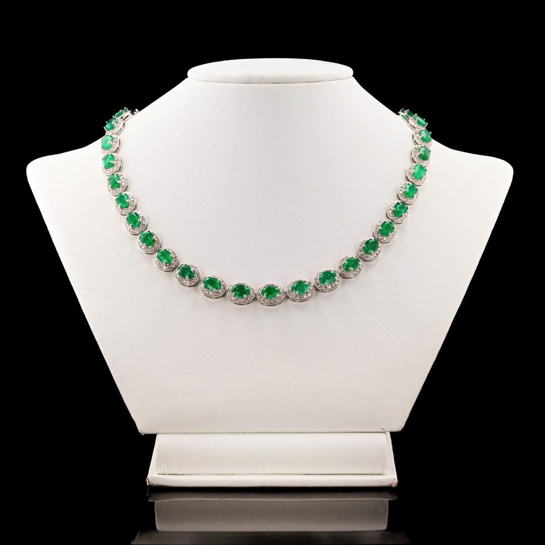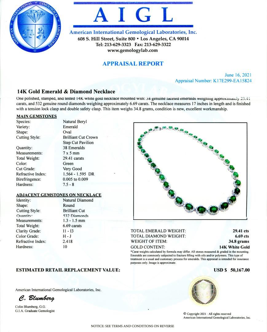 One polished, stamped, and tested 14K white gold necklace mounted witn: .36 genuine iacetea emeralds weighing approximately 29.41 carats, and 532 genuine round diamonds weighing approximately 6.69 carats. The necklace measures 17 inches in length and is finished with a tension lock clasp and double safety clasp. This item weighs 34.8 grams, condition is new, excellent workmanship. #MAIN GEMSTONES# Species: Natural Beryl Variety: Emerald Shape: Oval Cutting Style: Brilliant Cut Crown, Step Cut Pavilion Quantity: 38 Emeralds Measurements: 7 x 5mm Total Weight: 29.41 carats Color: Green Cut Grade: Very Good Refractive Index: 1.564 - 1.595 DR Birefringence: 0.005 to 0.009 Hardness: 7.5 - 8 #ADJACENT GEMSTONES ON NECKLACE# Identity: Natural Diamond Shape: Round Cutting Style: Brilliant Cut Quantity: 532 Diamonds Measurements: 1.3 - 1.5mm Total Weight: 6.69 carats Clarity Grade: I1 - I3 Color Grade: H - J Refractive Index: 2.418 Hardness: 10 TOTAL EMERALD WEIGHT: 29.41 cts TOTAL DIAMOND WEIGHT: 6.69 cts WEIGHT OF ITEM: 34.8 grams GOLD CONTENT: 14K White Gold Size: 17