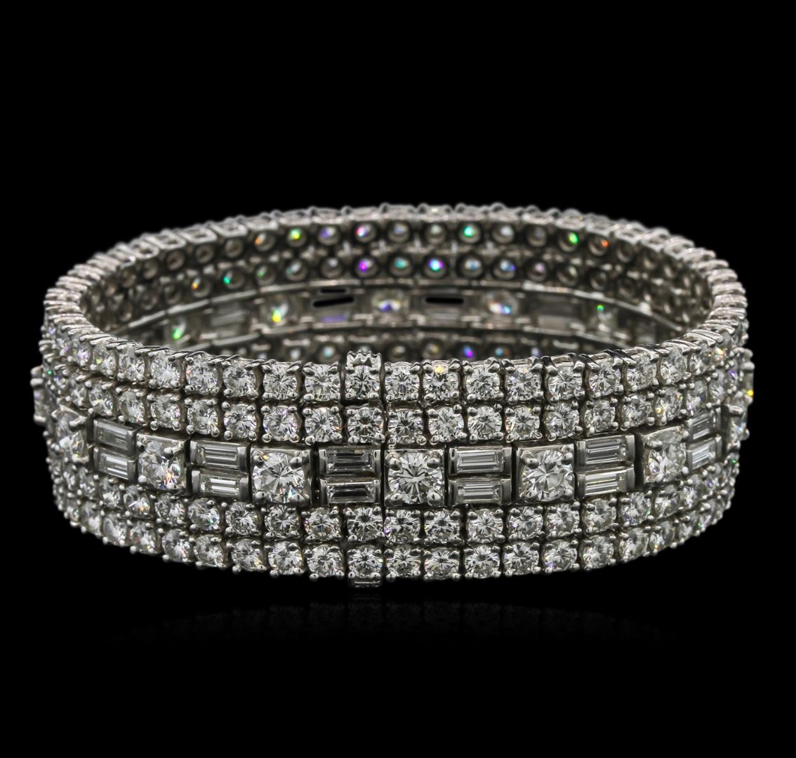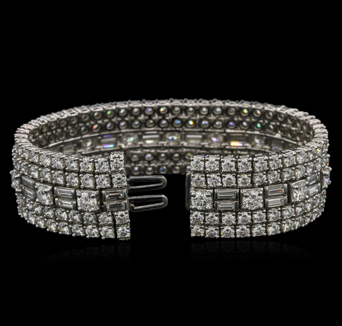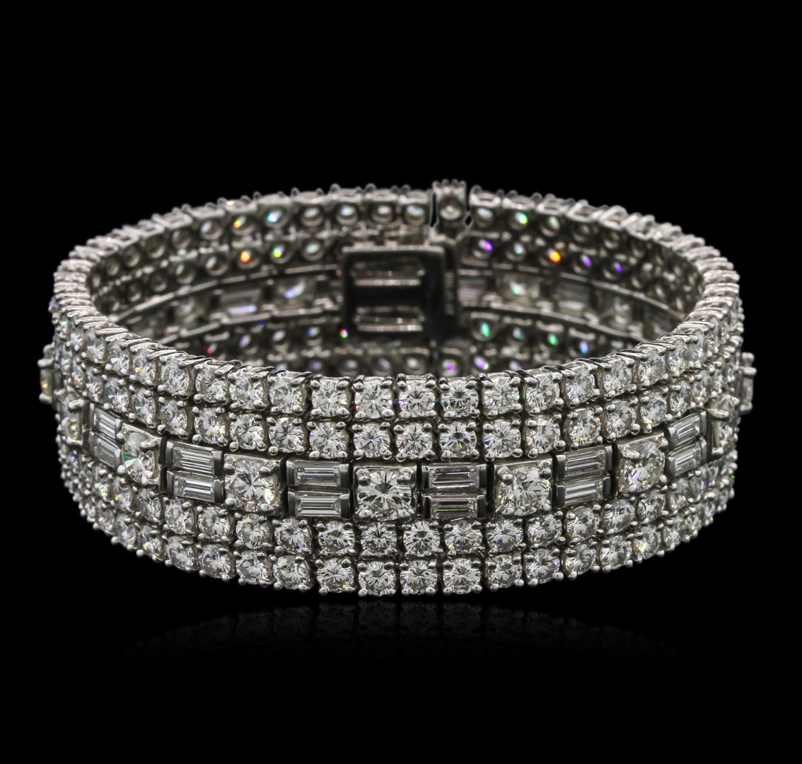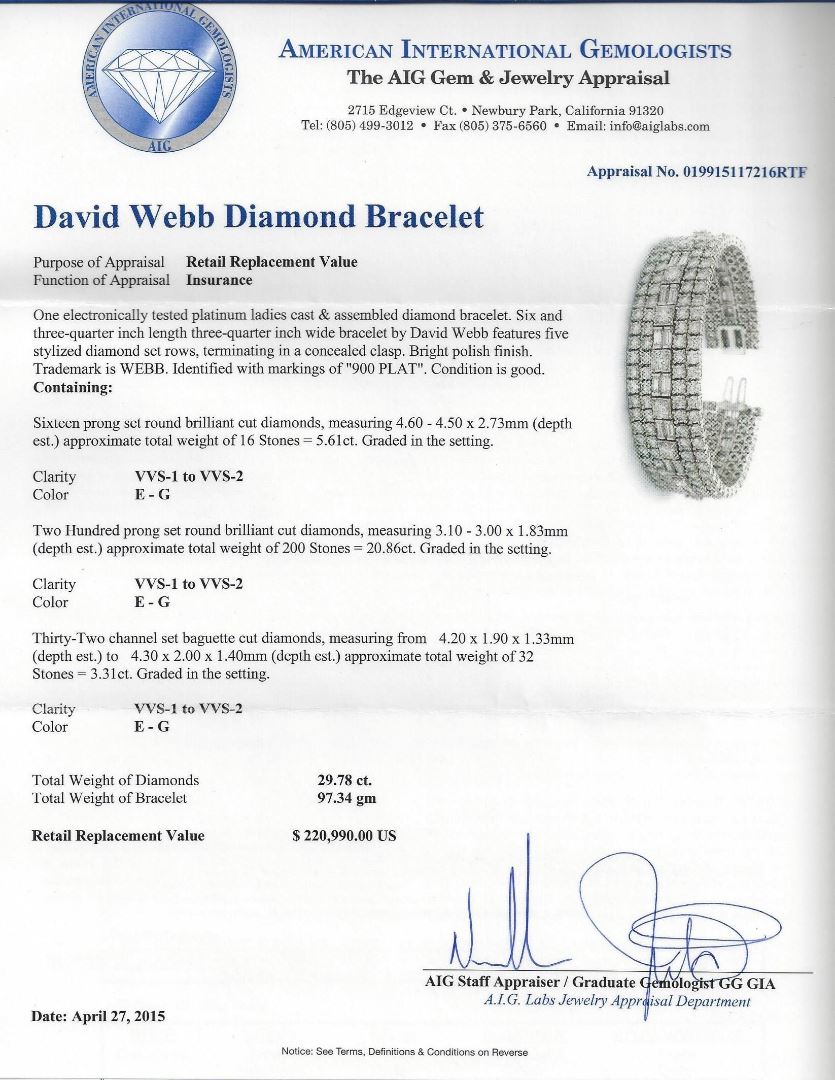 One electronically tested platinum ladies cast & assembled diamond bracelet. Six and three-quarter inch length three-quarter inch wide bracelet by David Webb features five stylized diamond set rows, terminating in a concealed clasp. Bright polish finish. Trademark is WEBB. Identified with markings of "900 PLAT". Condition is good. Containing: Sixteen prong set round brilliant cut diamonds, measuring 4.60 - 4.50 x 2.73mm (depth est.) approximate total weight of 16 Stones = 5.61ct. Graded in the setting. Clarity: VVS-1 to VVS-2. Color: E - G. Two Hundred prong set round brilliant cut diamonds, measuring 3.10 - 3.00 x 1.83mm (depth est.) approximate total weight of 200 Stones = 20.86ct. Graded in the setting. Clarity: VVS-1 to VVS-2. Color: E - G. Thirty-Two channel set baguette cut diamonds, measuring from 4.20 x 1.90 x 1.33mm (depth est.) to 4.30 x 2.00 x 1.40mm (depth est.) approximate total weight of 32 Stones = 3.31ct. Graded in the setting. Clarity: VVS-1 to VVS-2. Color: E - G. Total Weight of Diamonds: 29.78 ct. Total Weight of Bracelet: 97.34 gm. AIG Appraised at $220,990.00.