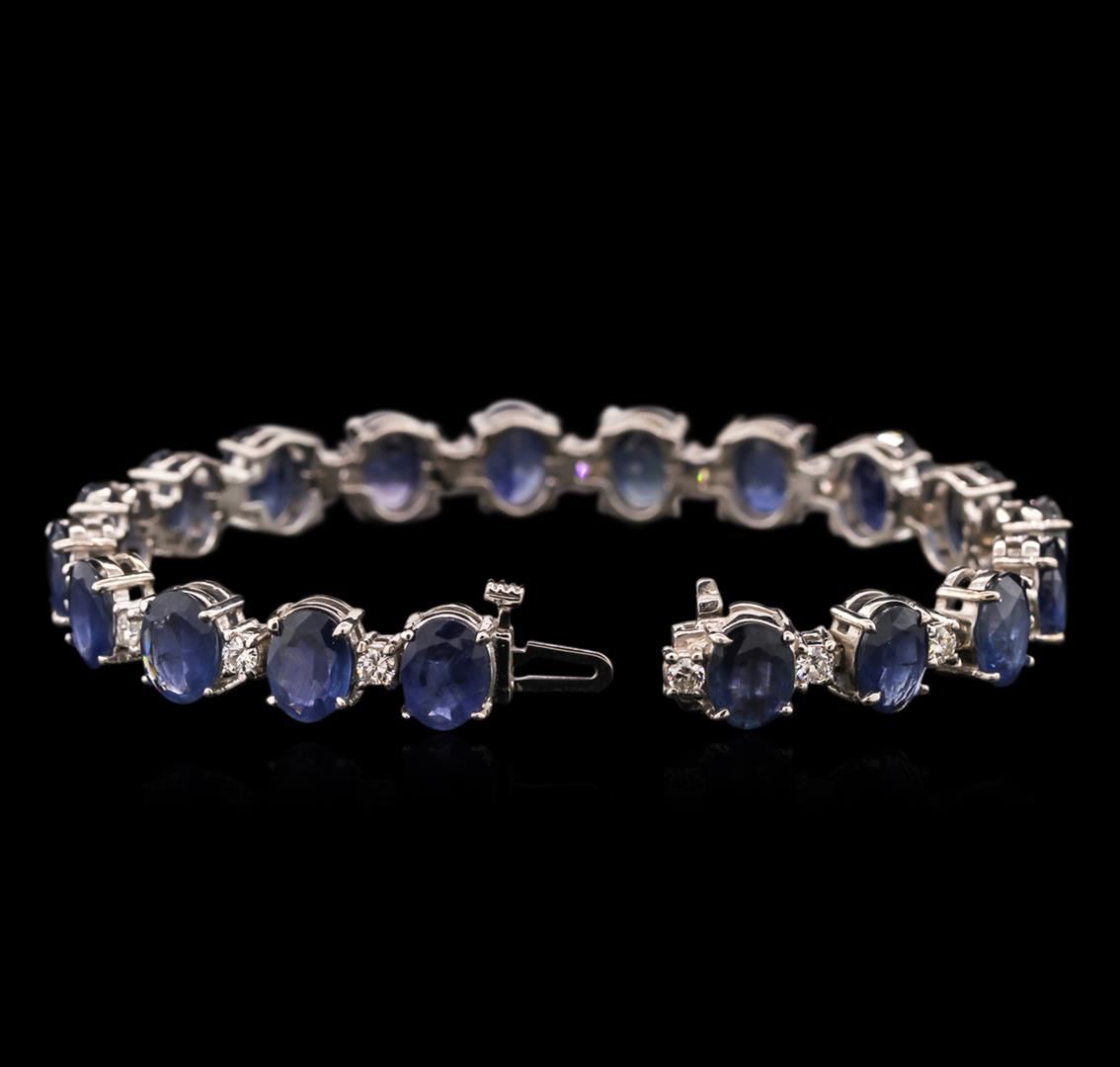 One electronically tested 14KT white gold ladies cast sapphire and diamond bracelet with a hidden box clasp with safety closer with a bright polish finish. 6.85" in length Condition is new. Containing: Nineteen prong set oval modified brilliant cut natural blue sapphires, measuring 8.00 x 6.00 x 3.90mm, approximate total weight of 29.83ct., clarity is moderately included, type II, medium light, very slightly grayish, blue color, (GIA B 4/3), cut is good. Nineteen prong set round brilliant cut diamonds, measuring 2.50 - 2.50 x 1.50mm (depth est.) approximate total weight of 19 Stones = 1.09ct. Clarity: SI-1. Color: H - I, Cut is Good. Colored gemstones are presumed to have been subjected to commonly used enhancement processes. All diamonds and colored gemstones are graded in the mounting, unless otherwise stated. Total Weight of Colored Stones 29.83ct. Total Weight of Diamonds 1.09ct. Total Weight of Bracelet 22.30 grams. GGL Appraised at $9,740.00.