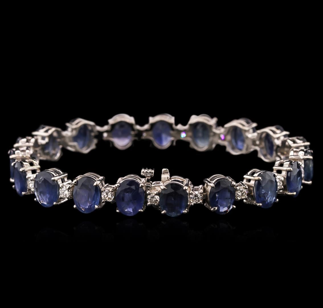 One electronically tested 14KT white gold ladies cast sapphire and diamond bracelet with a hidden box clasp with safety closer with a bright polish finish. 6.85" in length Condition is new. Containing: Nineteen prong set oval modified brilliant cut natural blue sapphires, measuring 8.00 x 6.00 x 3.90mm, approximate total weight of 29.83ct., clarity is moderately included, type II, medium light, very slightly grayish, blue color, (GIA B 4/3), cut is good. Nineteen prong set round brilliant cut diamonds, measuring 2.50 - 2.50 x 1.50mm (depth est.) approximate total weight of 19 Stones = 1.09ct. Clarity: SI-1. Color: H - I, Cut is Good. Colored gemstones are presumed to have been subjected to commonly used enhancement processes. All diamonds and colored gemstones are graded in the mounting, unless otherwise stated. Total Weight of Colored Stones 29.83ct. Total Weight of Diamonds 1.09ct. Total Weight of Bracelet 22.30 grams. GGL Appraised at $9,740.00.
