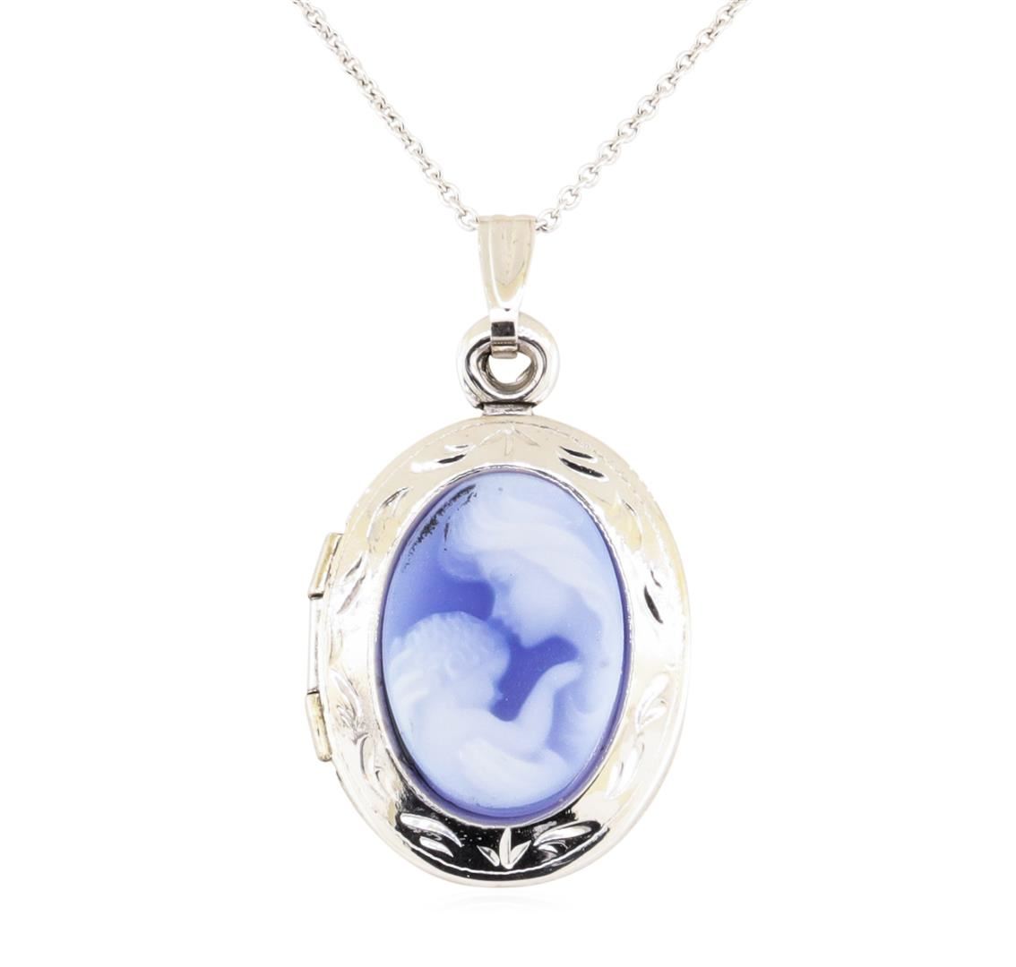 One electronically tested 14KT white gold lady's die struck & assembled fashion pendant & chain 16.0' long, 1mm round cable link with a spring ring clasp with a bright polish finish. Identified with markings of '14K'. Condition is Good. Containing: One oval cut natural blue lace agate, measuring 14.50 x 10.00 x 4.00mm, (depth est.) approximate weight of 3.00 ct.The featured blue lace agate is cut into a cameo depicting a mother and child. Graded in the setting. Total Weight of Colored Stones 3.00 ct.. Total Weight of Pendant & Chain 4.30gm GAS Appraised at $1245.00. GAS Appraised.