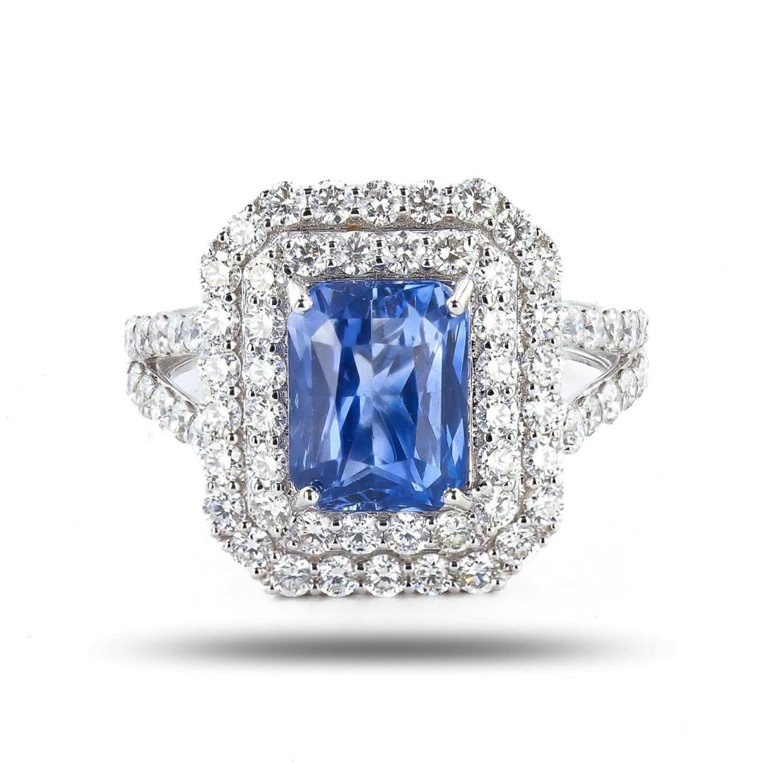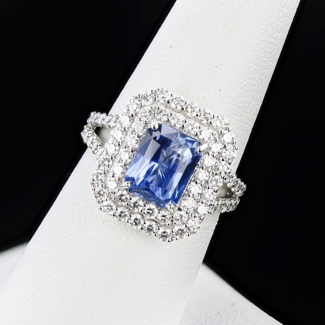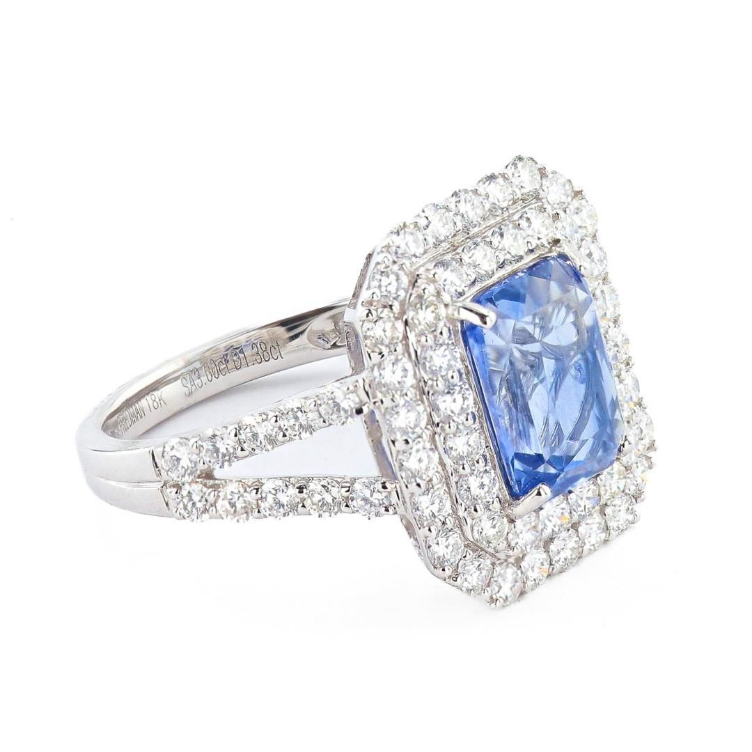 One polished. stamped. and tested 18K white gold ring marked Oscar Friedman. The ring is mounted with: 1 genuine GIA certified sapphire center stone weighing 3.00 carats, and 66 genuine round diamonds weighing approximately 1.38 carats. This item weighs 4.1 grams, condition is new, excellent workmanship. #MAIN GEMSTONE# GIA Report No.: 2231096298 Species: Natural Corundum Variety: Sapphire Shape: Octagonal Cutting Style: Modified Brilliant Cut Measurements: 8.93 x 7.02 x 4.55mm Weight: 3.00 carats Color: Blue Transparency: Transparent Refractive Index: 1.762 - 1.770 DR Birefringence: 0.008 - 0.010 Hardness: 9 #ADJACENT GEMSTONES ON RING# Identity: Natural Diamond Shape: Round Cutting Style: Brilliant Cut Quantity: 66 Diamonds Measurements: 1.8mm Total Weight: 1.38 carats Clarity Grade: VS1-SI1 Color Grade: F-G Refractive Index: 2.417 Hardness: 10 SAPPHIRE WEIGHT: 3.00 ct TOTAL DIAMOND WEIGHT: 1.38 cts WEIGHT OF ITEM: 4.1 grams GOLD CONTENT: 18K White Gold Size: 6 3/4
