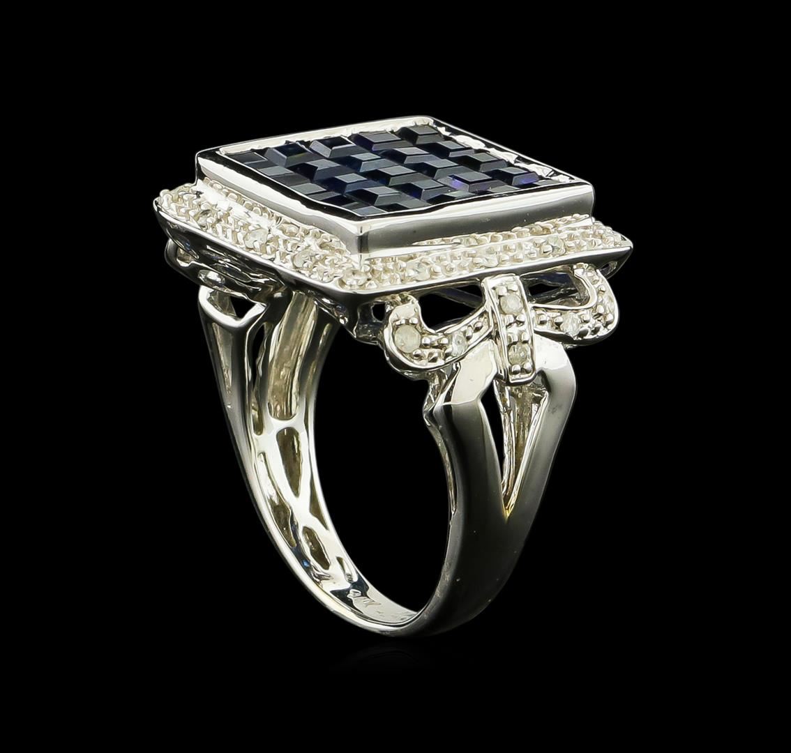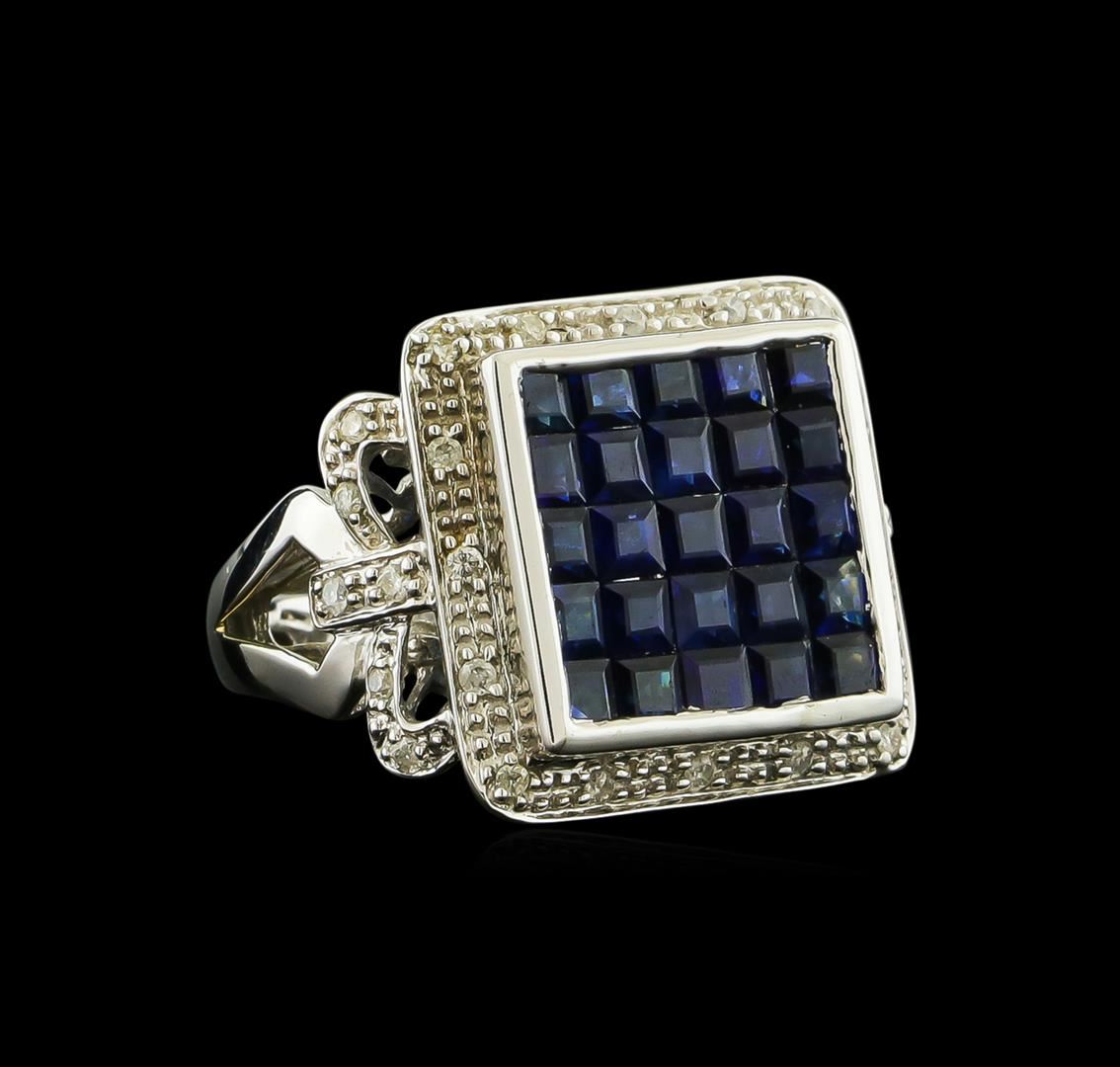 One electronically tested 14KT white gold lady's cast fashion ring with a square halo with a bright polish finish. The featured lady's ring has a shank measuring 2.68 millimeters wide. Identified with markings of "14K". Condition is new, good workmanship. Containing: Twenty-five invisible set princess modified brilliant cut natural blue sapphires, measuring 2.60 x 2.50 x 1.88mm, approximate total weight of 3.00ct., clarity is eye clean, type II, dark, moderately strong, blue color, (GIA B 7/4), cut is very good. Transmitting light with a minimum of distortion, transparent. Colored gemstones are presumed to have been subjected to commonly used enhancement processes. Graded in the setting. Twenty-Eight prong set round brilliant cut diamonds, measuring 1.30 - 1.20 x 0.75mm (depth est.) approximate total weight of 28 Stones = 0.19ct. Graded in the setting. Clarity: SI-2 to I-2. Color: H - I. Cut Good. Total Weight of Colored Stones 3.00ct. Total Weight of Diamonds 0.19ct. Total Weight of Ring 5.30gm GAS Appraised at $4,680.00.