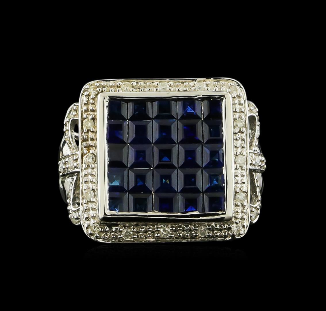 One electronically tested 14KT white gold lady's cast fashion ring with a square halo with a bright polish finish. The featured lady's ring has a shank measuring 2.68 millimeters wide. Identified with markings of "14K". Condition is new, good workmanship. Containing: Twenty-five invisible set princess modified brilliant cut natural blue sapphires, measuring 2.60 x 2.50 x 1.88mm, approximate total weight of 3.00ct., clarity is eye clean, type II, dark, moderately strong, blue color, (GIA B 7/4), cut is very good. Transmitting light with a minimum of distortion, transparent. Colored gemstones are presumed to have been subjected to commonly used enhancement processes. Graded in the setting. Twenty-Eight prong set round brilliant cut diamonds, measuring 1.30 - 1.20 x 0.75mm (depth est.) approximate total weight of 28 Stones = 0.19ct. Graded in the setting. Clarity: SI-2 to I-2. Color: H - I. Cut Good. Total Weight of Colored Stones 3.00ct. Total Weight of Diamonds 0.19ct. Total Weight of Ring 5.30gm GAS Appraised at $4,680.00.