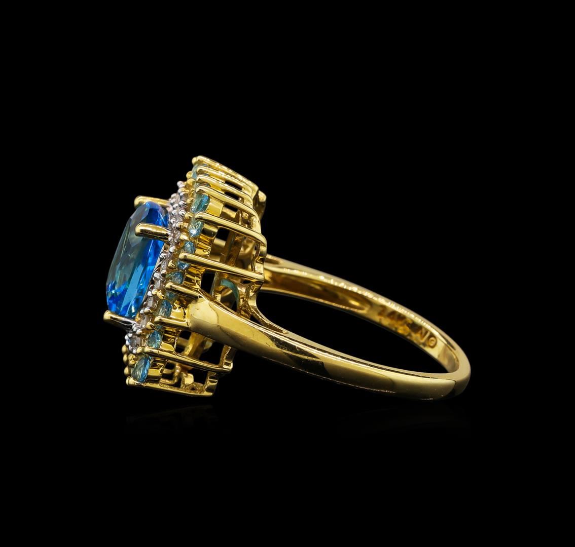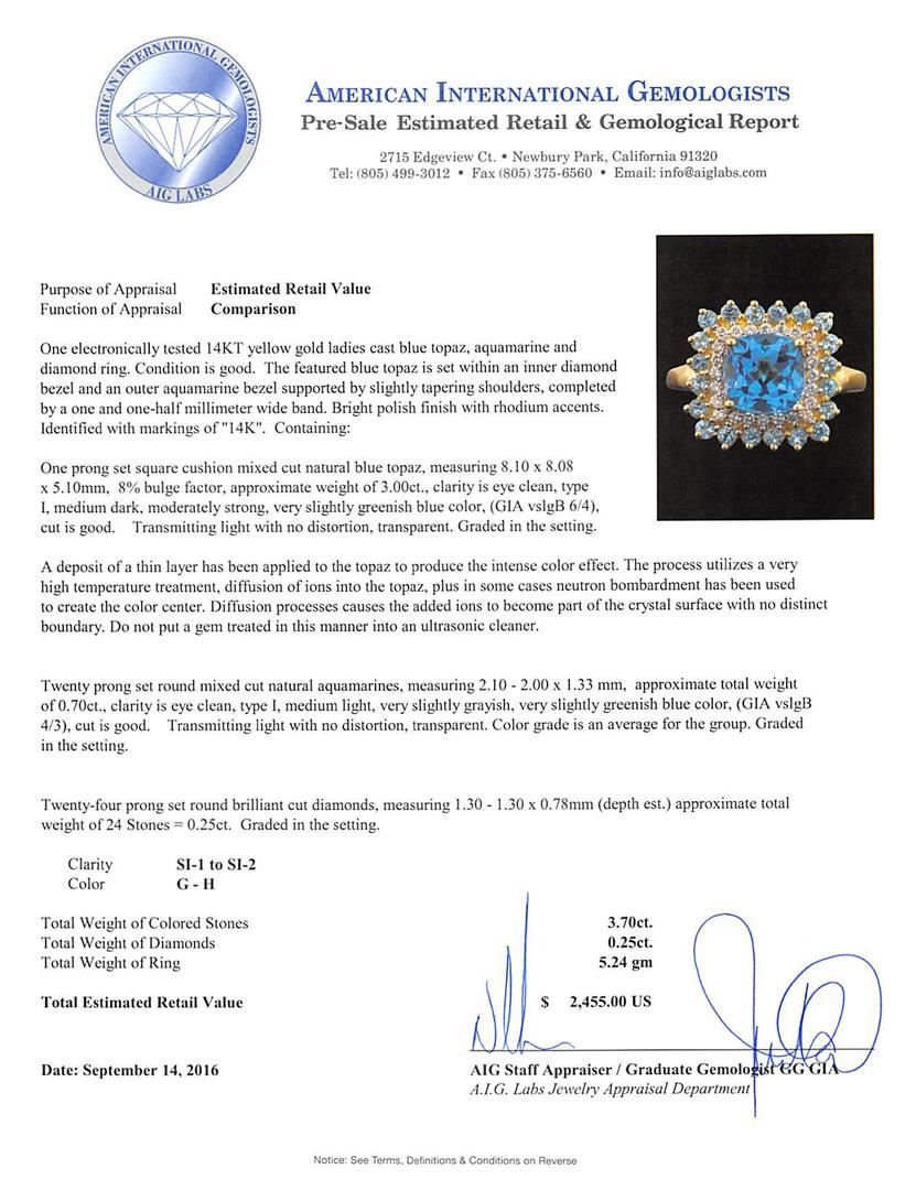 One electronically tested 14KT yellow gold ladies cast blue topaz, aquamarine and diamond ring. The featured blue topaz is set within an inner diamond bezel and an outer aquamarine bezel supported by slightly tapering shoulders, completed by a one and one-half millimeter wide band. Bright polish finish with rhodium accents. Identified with markings of '14K'. Condition is good. Containing: One prong set square cushion mixed cut natural blue topaz, measuring 8.10 x 8.08 x 5.10mm, 8%. bulge factor, approximate weight of 3.00ct., clarity is eye clean, type I, medium dark, moderately strong, very slightly greenish blue color, (GIA vslgB 6/4), cut is good. Transmitting light with no distortion, transparent. Graded in the setting. A deposit of a thin layer has been applied to the topaz to produce the intense color effect. The process utilizes a very high temperature treatment, diffusion of ions into the topaz, plus in some cases neutron bombardment has been used to create the color center. Diffusion processes causes the added ions to become part of the crystal surface with no distinct boundary. Do not put a gem treated in this manner into an ultrasonic cleaner. Twenty prong set round mixed cut natural aquamarines, measuring 2.10 - 2.00 x 1.33 mm, approximate total weight of 0.70ct., clarity is eye clean, type I, medium light, very slightly grayish, very slightly greenish blue color, (GIA vslgB 4/3), cut is good. Transmitting light with no distortion, transparent. Color grade is an average for the group. Graded in the setting. Twenty-Four prong set round brilliant cut diamonds, measuring 1.30 - 1.30 x 0.78mm (depth est.) approximate total weight of 24 Stones = 0.25ct. Graded in the setting. Clarity SI-1 to SI-2. Color: G - H. Total Weight of Colored Stones 3.70ct.. Total Weight of Diamonds 0.25ct.. Total Weight of Ring 5.24gm. AIG Appraised at $2,455.00.