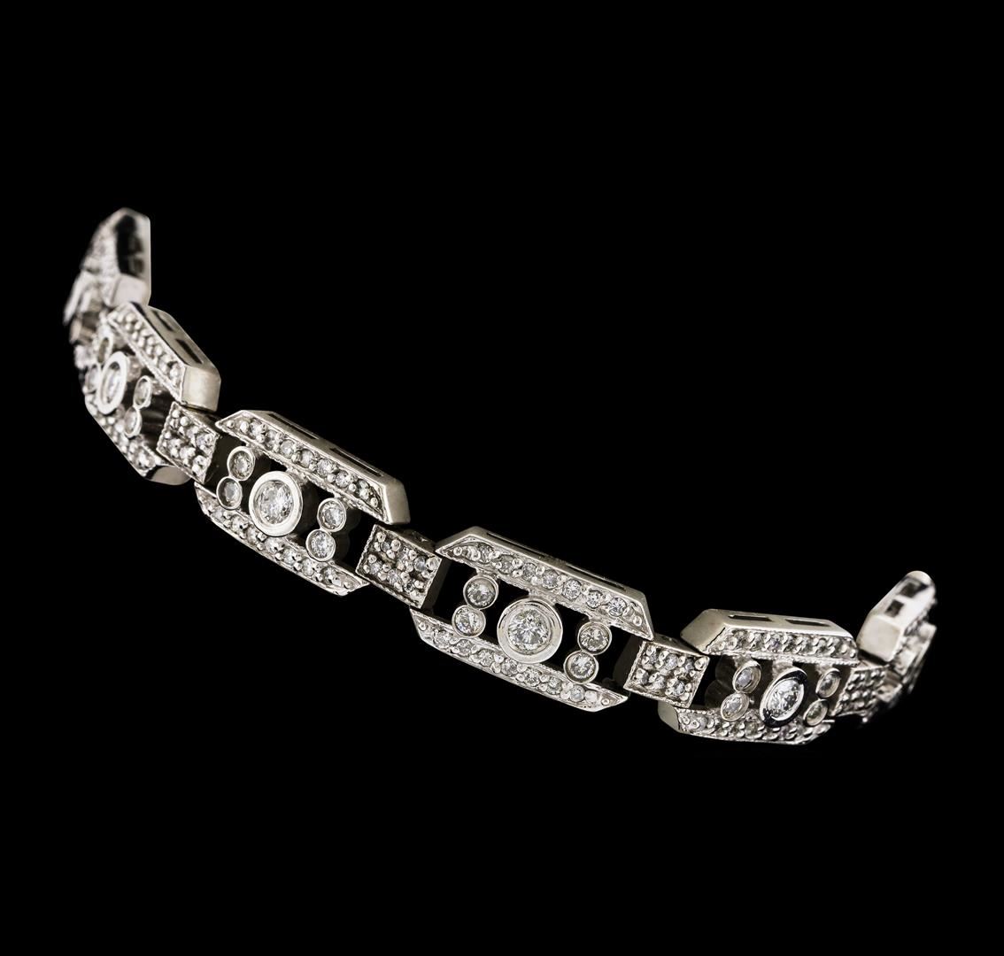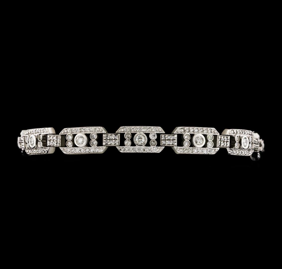 One electronically tested 14KT white gold lady's combination cast & assembled fashion bracelet with a tongue clasp with foldover safety with a bright polish with milgrain detailing finish. The featured lady's bracelet has an attached safety chain and measures approximately 8 inches in length. Identified with markings of '14K'. Condition is new, good workmanship. Containing: Twelve bezel set round brilliant cut diamonds, measuring 2.80 - 2.70 x 1.71mm (depth est.) approximate total weight of 12 Stones = 0.95ct. Graded in the setting. Clarity SI-2 to I-1. Color: I - J Cut Very Good Forty-Eight bezel set round brilliant cut diamonds, measuring 1.70 - 1.50 x 0.99mm (depth est.) approximate total weight of 48 Stones = 0.75ct. Graded in the setting. Clarity SI-1 to I-1. Color: H - I Cut Good Two Hundred Forty prong set round brilliant cut diamonds, measuring 1.20 - 1.10 x 0.69mm (depth est.) approximate total weight of 240 Stones = 1.30ct. Graded in the setting. Clarity SI-1 to SI-2. Color: H - I Cut Good. Total Weight of Diamonds 3.00ct.. Total Weight of Bracelet 20.00gm. GAS Appraised at $10,625.00.