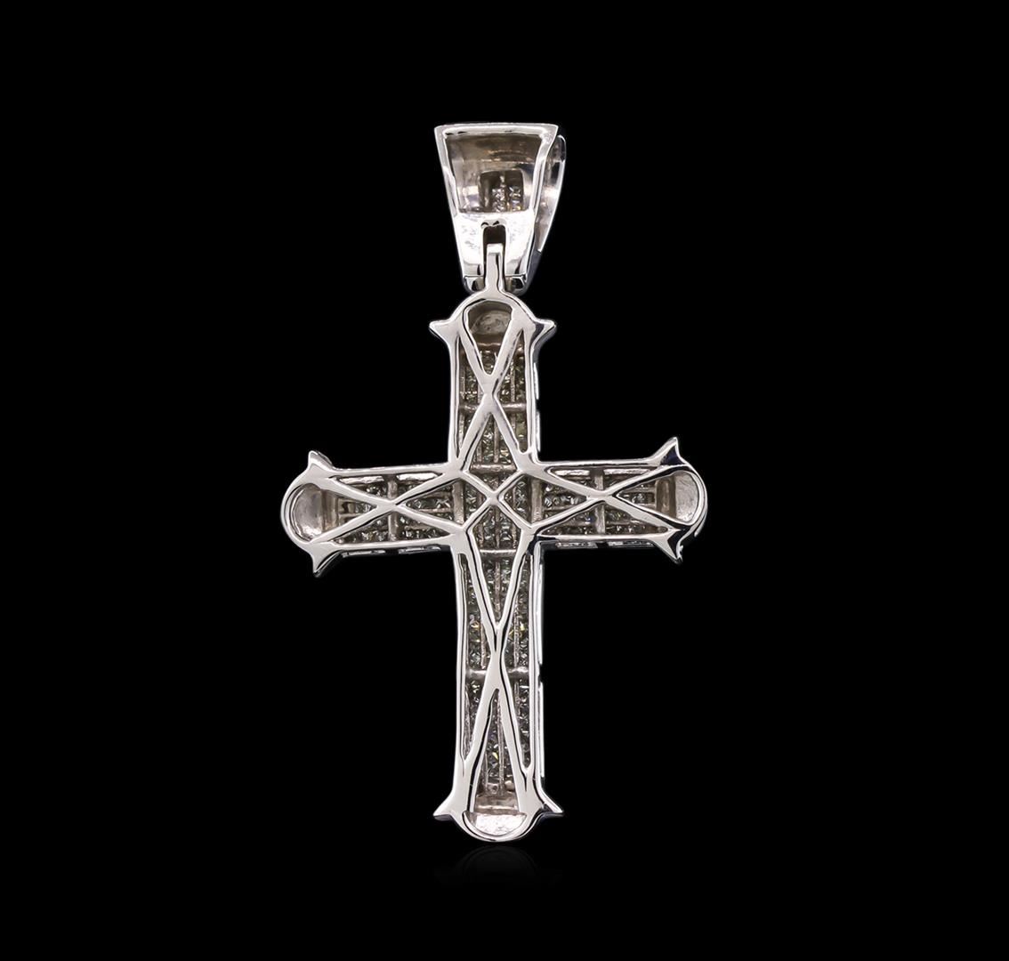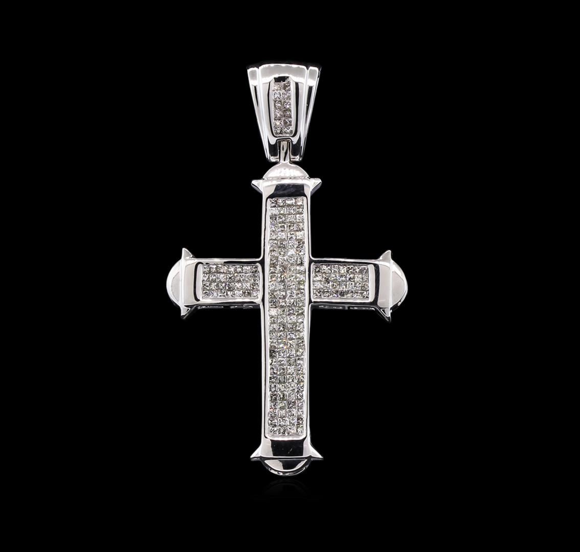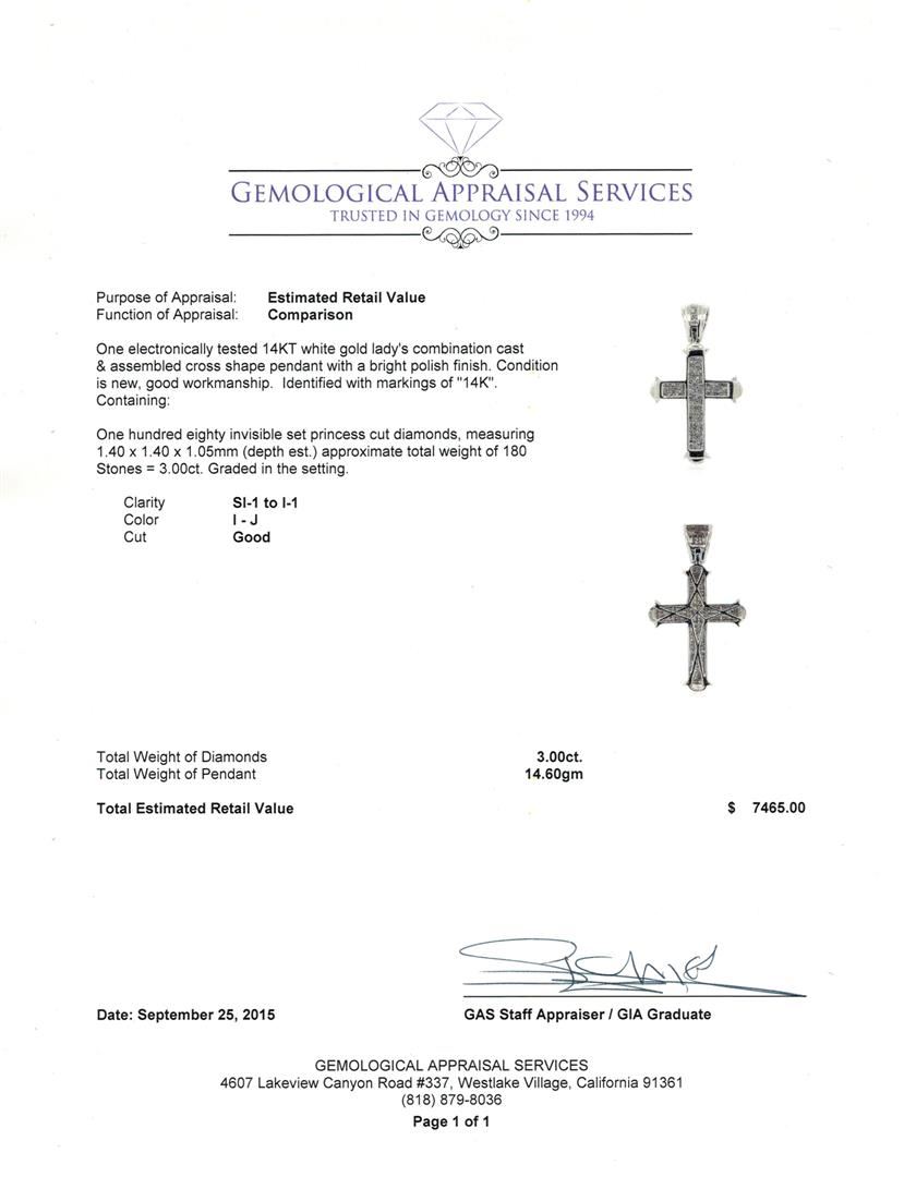 One electronically tested 14KT white gold lady's combination cast & assembled cross shape pendant with a bright polish finish. Identified with markings of "14K". Condition is new, good workmanship. Containing: One Hundred Eighty invisible set princess cut diamonds, measuring 1.40 x 1.40 x 1.05mm (depth est.) approximate total weight of 180 Stones = 3.00ct. Graded in the setting. Clarity: SI-1 to I-1. Color: I - Good. Total Weight of Diamonds 3.00ct. Total Weight of Pendant 14.60gm at $7465.00.. GAS Appraised at $7,465.00.