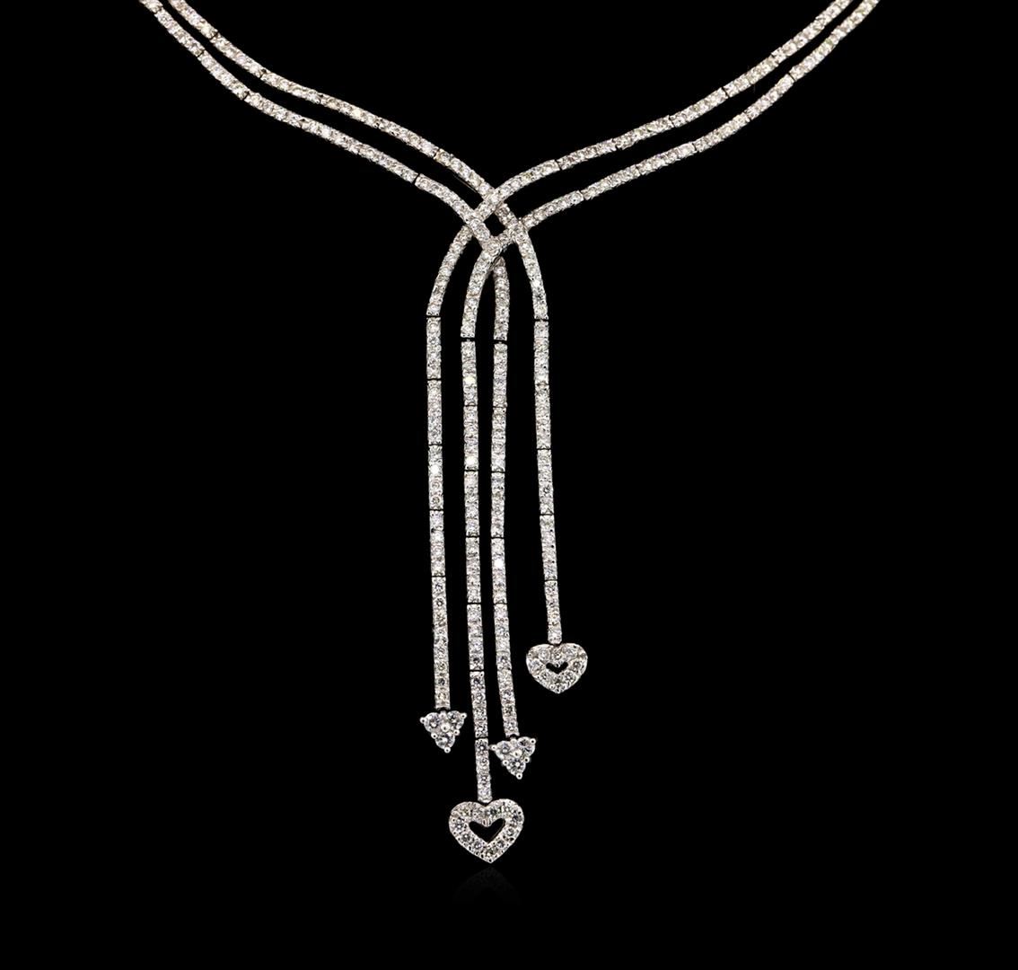 One electronically tested 14KT white gold ladies cast & assembled diamond necklace with a bright polish finish. Condition is good. The twenty inch necklace features diamond ribbons in a stylized lariat design accented by a four diamond ribbon drop with diamond set hearts, terminating in a concealed clasp with safety. Identified with markings of "14K". Containing: One hundred fifty prong set round brilliant cut diamonds, measuring 2.10 - 1.50 x 1.08mm (depth est.) approximate total weight of 150 Stones = 3.00ct. Graded in the setting. Clarity: VS-2 to SI-2. Color: H - J. Total Weight of Diamonds: 3.00ct. Total Weight of Necklace: 28.69 grams. AIG Appraised at $17,565.00.