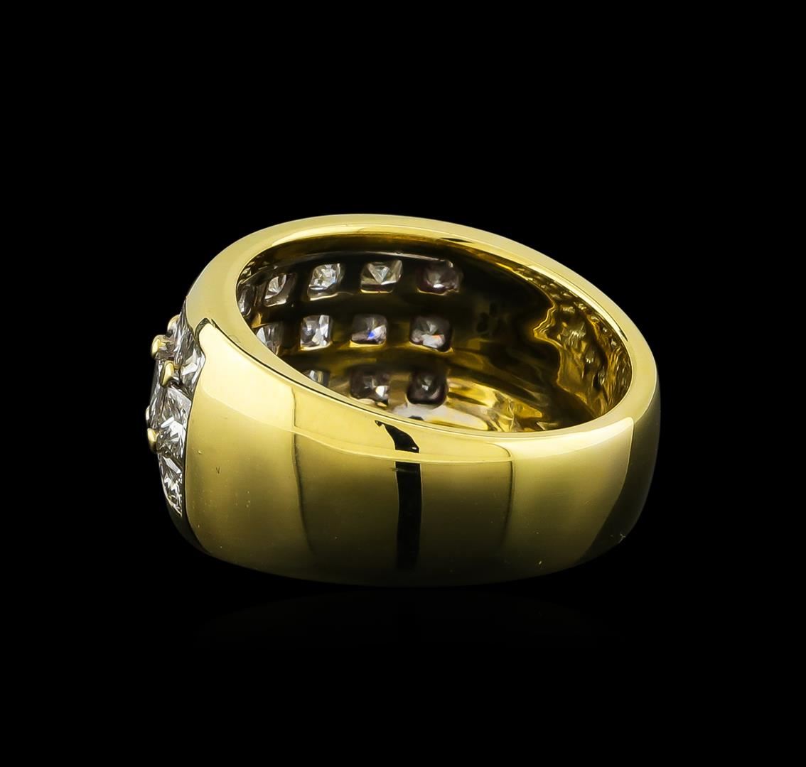 One electronically tested 14KT yellow gold lady's cast wide dome style ring with a bright polish finish. The featured lady's ring has a shank measuring 6.10 millimeters wide. Identified with markings of "14K". Condition is new, good workmanship. Containing: Twenty-Four prong set princess cut diamonds, measuring 3.00 x 2.50 x 1.95mm (depth est.) approximate total weight of 24 Stones = 3.00ct. Graded in the setting. Clarity: VS-2 to SI-2. Color: G - Good. Total Weight of Diamonds 3.00ct. Total Weight of Ring 8.80gm GAS Appraised at $8,990.00.
