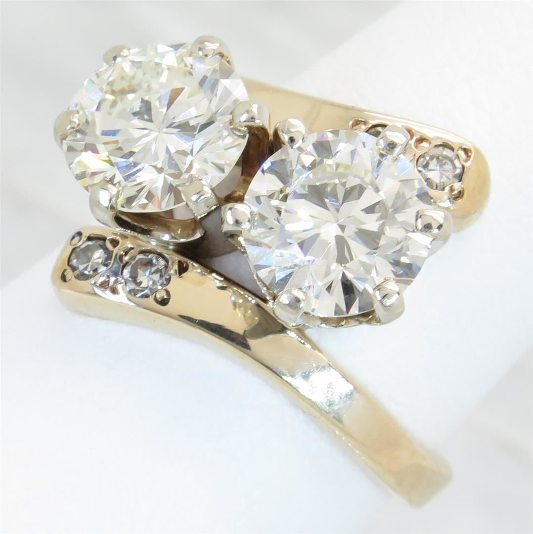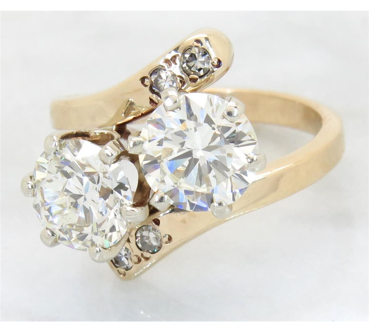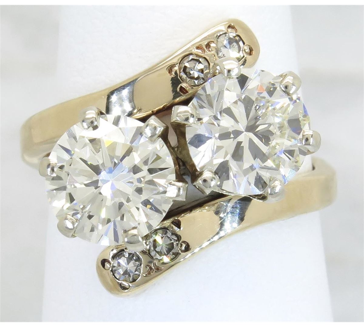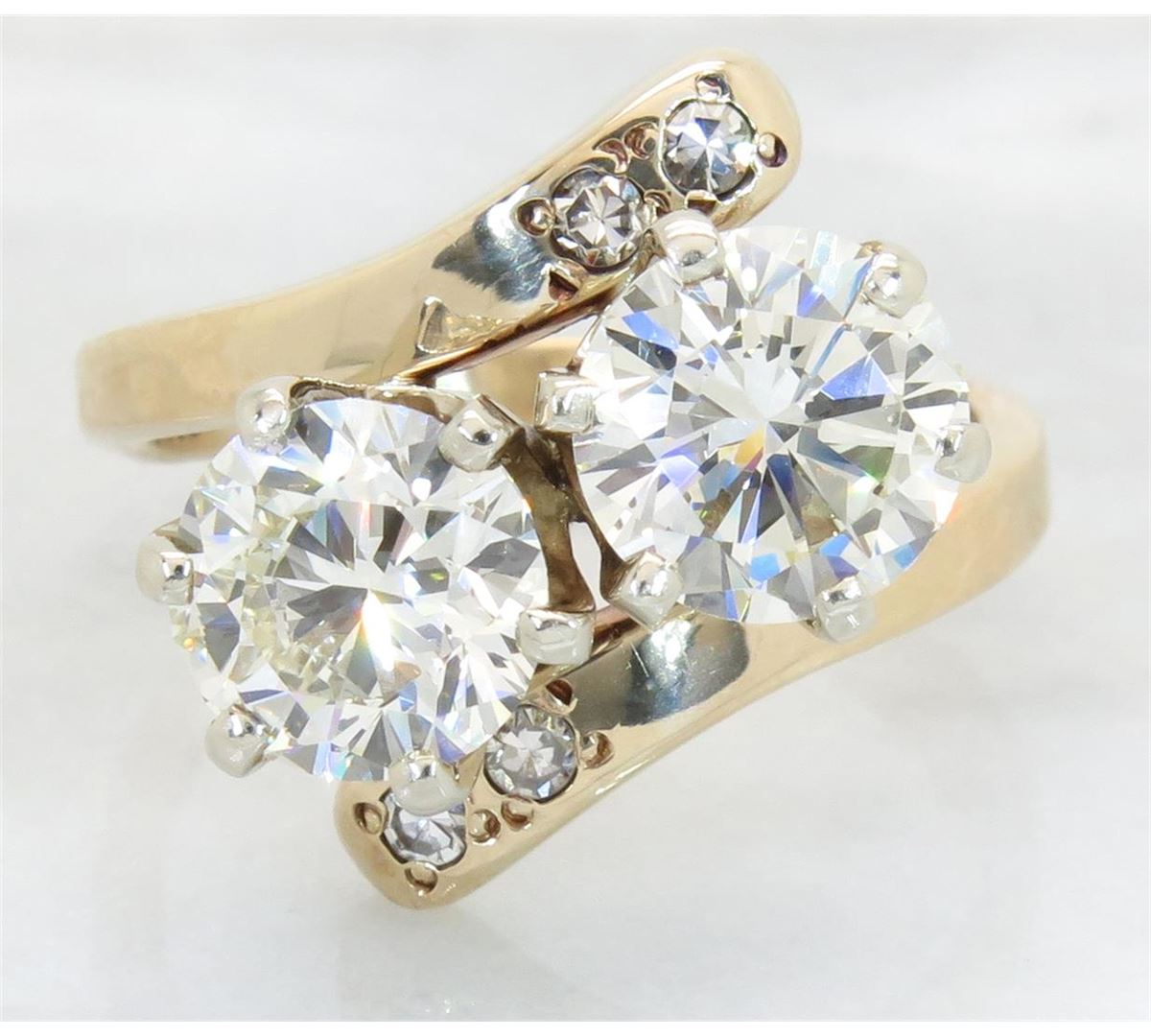 One tested 14K yellow gold diamond ring. Containing: Two Round Transitional Cut Diamonds. Approximate size: 1.48CT and 1.42CT, Clarity: VS1-VS2, Color: L-N. Four Single Cut Diamonds. Approximate total diamond weight: 3.00CTW. All diamonds are graded in the mounting unless otherwise stated. Weight of ring: 5.9 grams, Size: 5.5.