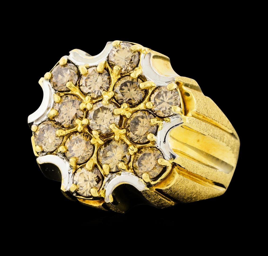 One electronically tested 14KT yellow and white gold man's combination cast & assembled fashion ring with a tapered shank with a bright polish and satin finish. The featured man's ring has a shank measuring 4.11 millimeters wide. Identified with markings of '14K'. Condition is new, good workmanship. Containing: Thirteen prong set round brilliant cut diamonds, measuring 4.10 - 3.70 x 2.42mm (depth est.) approximate total weight of 13 Stones = 3.00ct. Graded in the setting. Clarity SI-1 to SI-2 Cut Good. Total Weight of Diamonds 3.00ct.. Total Weight of Ring 10.30gm. GAS Appraised at $4,920.00.