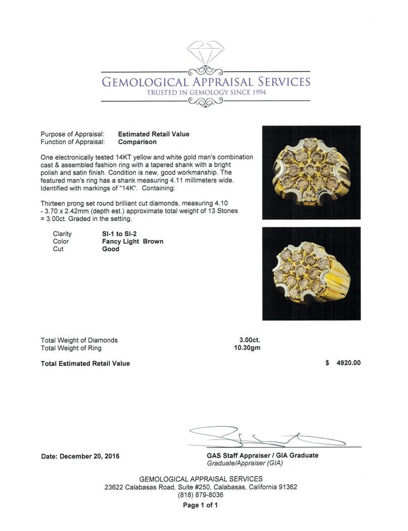 One electronically tested 14KT yellow and white gold man's combination cast & assembled fashion ring with a tapered shank with a bright polish and satin finish. The featured man's ring has a shank measuring 4.11 millimeters wide. Identified with markings of '14K'. Condition is new, good workmanship. Containing: Thirteen prong set round brilliant cut diamonds, measuring 4.10 - 3.70 x 2.42mm (depth est.) approximate total weight of 13 Stones = 3.00ct. Graded in the setting. Clarity SI-1 to SI-2 Cut Good. Total Weight of Diamonds 3.00ct.. Total Weight of Ring 10.30gm. GAS Appraised at $4,920.00.