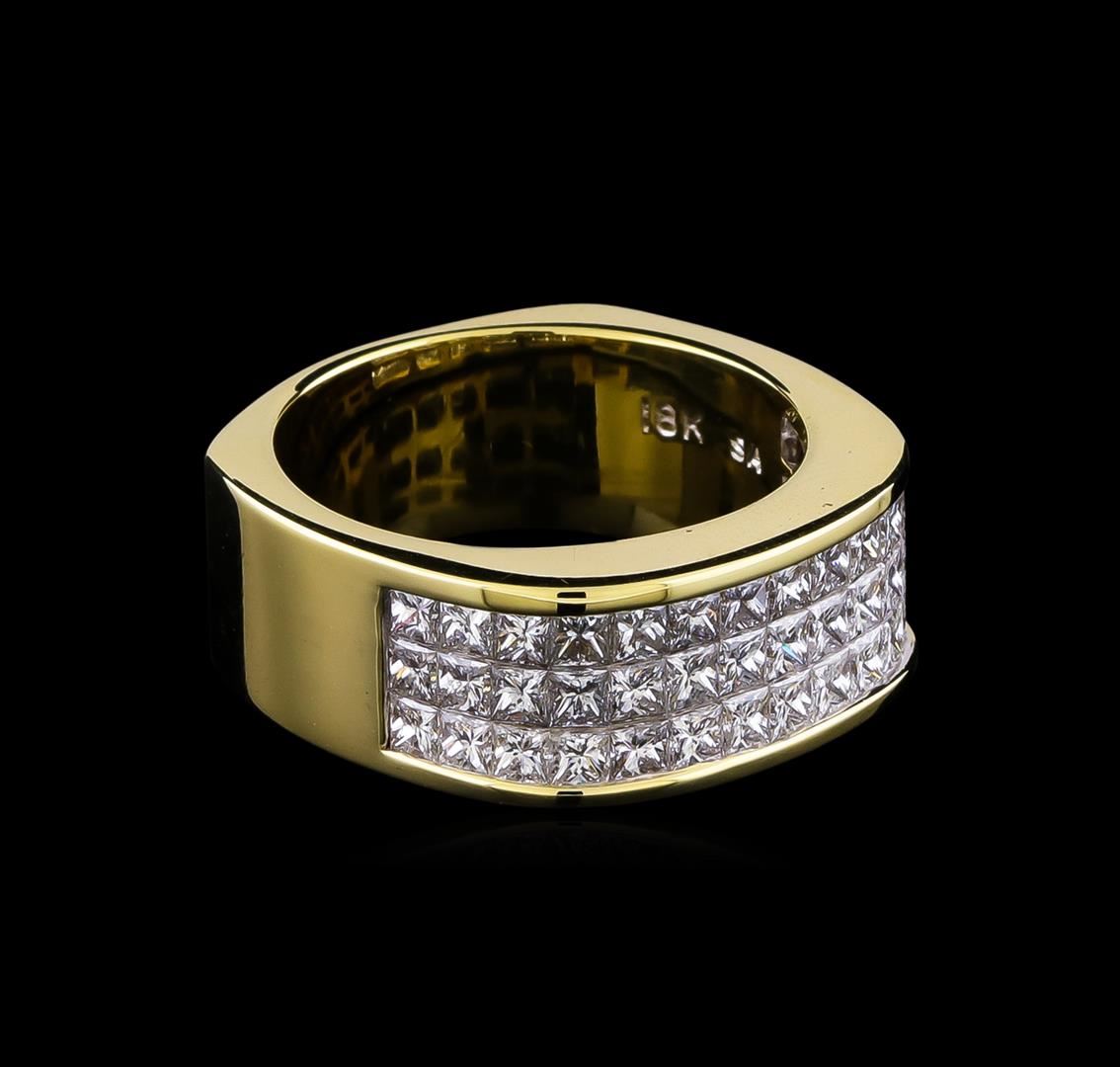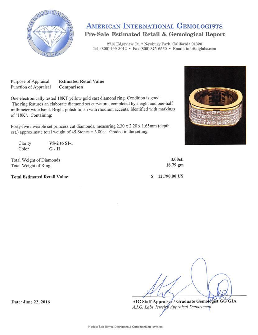 One electronically tested 18KT yellow gold cast diamond ring. The ring features an elaborate diamond set curvature, completed by a eight and one-half millimeter wide band. Bright polish finish with rhodium accents. Identified with markings of "18K". Condition is good. Containing: Forty-Five invisible set princess cut diamonds, measuring 2.30 x 2.20 x 1.65mm (depth est.) approximate total weight of 45 Stones = 3.00ct. Graded in the setting. Clarity: VS-2 to SI-1 . Color: G - H. Total Weight of Diamonds 3.00ct.. Total Weight of Ring 18.79gm. AIG Appraised at $12,790.00.