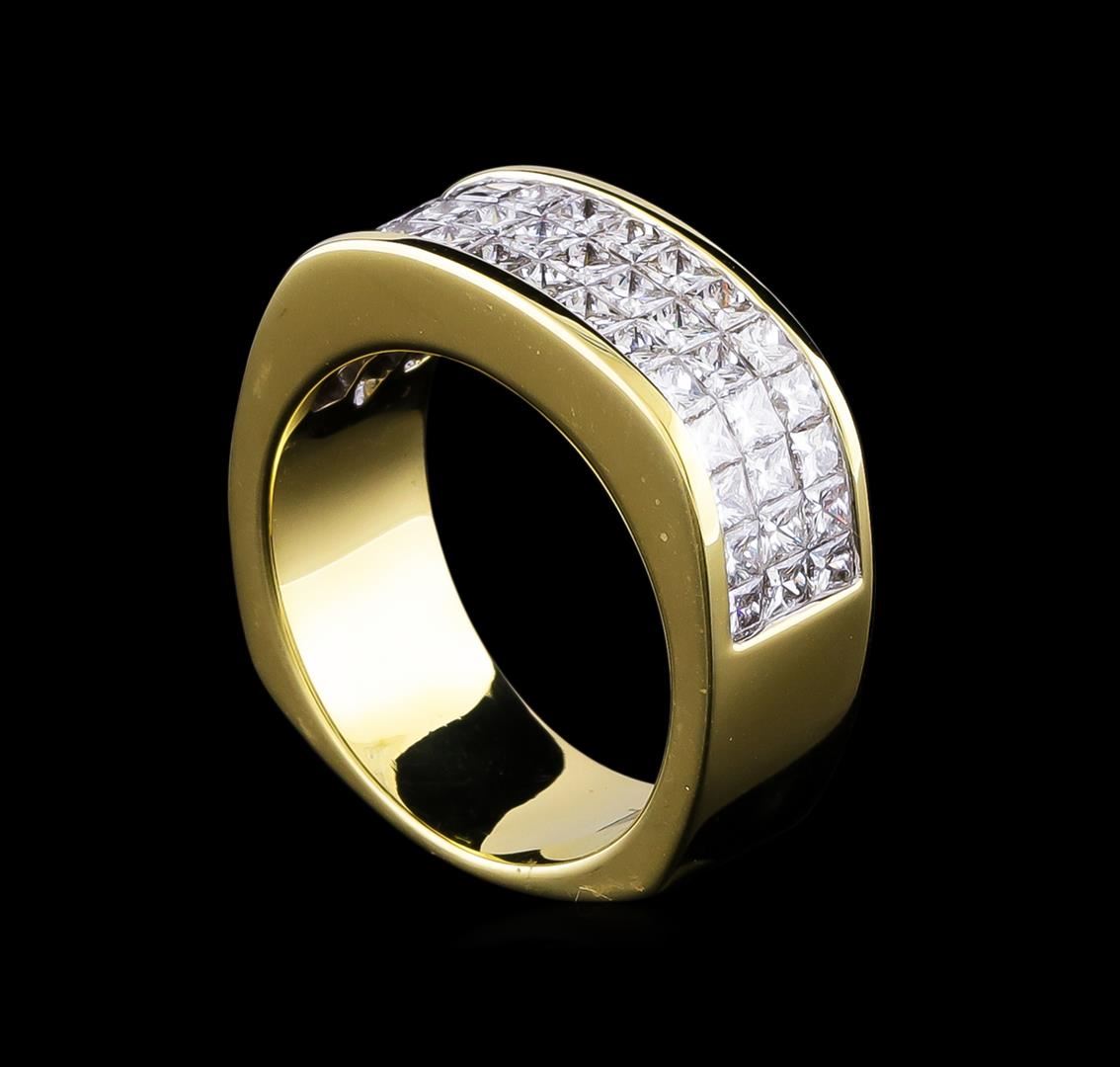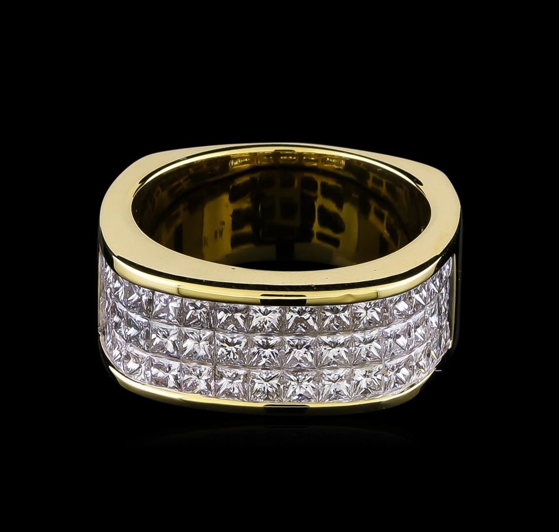 One electronically tested 18KT yellow gold cast diamond ring. The ring features an elaborate diamond set curvature, completed by a eight and one-half millimeter wide band. Bright polish finish with rhodium accents. Identified with markings of "18K". Condition is good. Containing: Forty-Five invisible set princess cut diamonds, measuring 2.30 x 2.20 x 1.65mm (depth est.) approximate total weight of 45 Stones = 3.00ct. Graded in the setting. Clarity: VS-2 to SI-1 . Color: G - H. Total Weight of Diamonds 3.00ct.. Total Weight of Ring 18.79gm. AIG Appraised at $12,790.00.