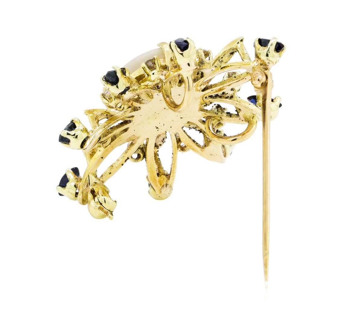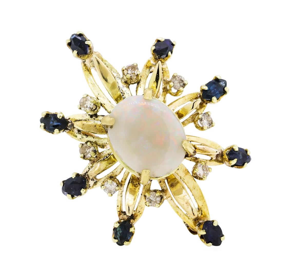One lady's pin/pendant featuring: 14KT yellow gold weighing 6.8 grams containing one opal weighing 3.00ct, sapphires weighing 0.60ctw and diamonds weighing 0.25ctw.