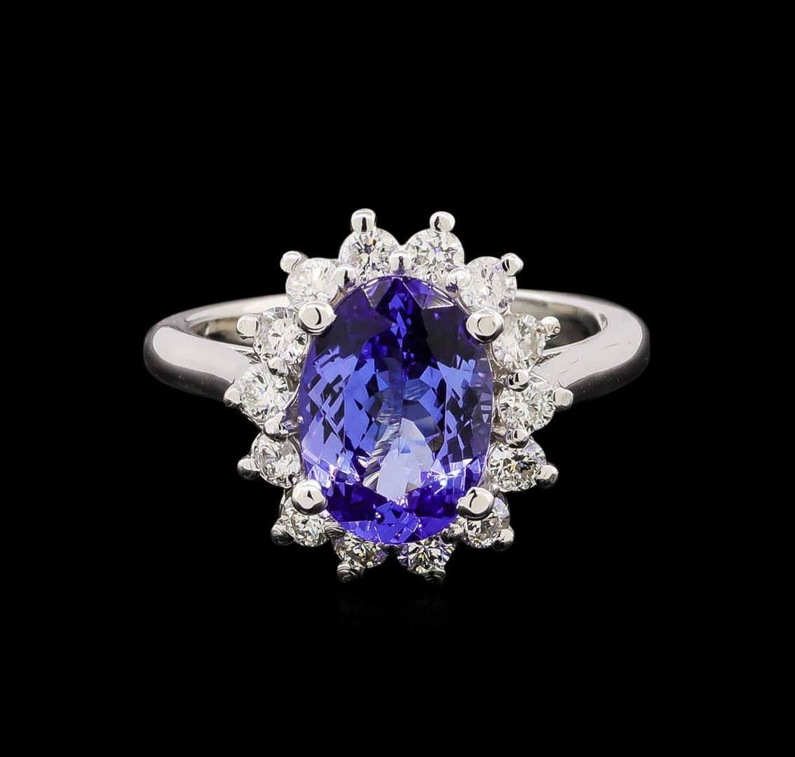 One electronically tested 14KT white gold lady's cast fashion ring with a cathedral shank with a basket halo with a bright polish finish. The featured lady's ring has a shank measuring 2.21 millimeters wide. Identified with markings of '14K'. Condition is new, good workmanship. Containing: One prong set oval modified brilliant cut natural tanzanite, measuring 11.03 x 7.89 x 4.88mm, (depth est.) approximate weight of 3.00ct., clarity is eye clean, medium, very slightly grayish, violetish blue color, (GIA vB 5/3), cut is very good. Transmitting light with no distortion, transparent. Colored gemstones are presumed to have been subjected to commonly used enhancement processes. Graded in the setting. Fourteen prong set round brilliant cut diamonds, measuring 2.40 - 2.30 x 1.46mm (depth est.) approximate total weight of 14 Stones = 0.70ct. Graded in the setting. Clarity SI-1 to I-1. Color: H - I Cut Good. Total Weight of Colored Stones 3.00ct.. Total Weight of Diamonds 0.70ct.. Total Weight of Ring 5.60gm. GAS Appraised at $7,030.00.