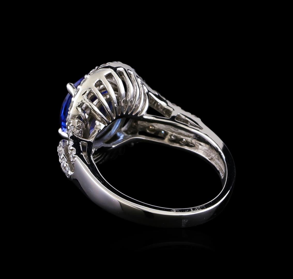 One electronically tested 14KT white gold lady's cast fashion ring with a split bypass shank with a bright polish finish. The featured lady's ring has a shank measuring 2.55 millimeters in width. Identified with markings of "14K". Condition is new, good workmanship. Containing: One prong set oval modified brilliant cut natural tanzanite, measuring 10.83 x 8.13 x 4.95mm, (depth est.) 8%. bulge factor, approximate weight of 3.00ct., clarity is eye clean, medium light, moderately strong, violetish blue color, (GIA vB 4/4), cut is very good. Transmitting light with no distortion, transparent. Colored gemstones are presumed to have been subjected to commonly used enhancement processes. Graded in the setting. Forty-Four prong set round brilliant cut diamonds, measuring 1.50 - 1.40 x 0.90mm (depth est.) approximate total weight of 44 Stones = 0.51ct. Graded in the setting. Clarity: SI-1 to SI-2. Color: H - I. Cut Good. Total Weight of Colored Stones 3.00ct. Total Weight of Diamonds 0.51ct. Total Weight of Ring 5.00gm. GAS Appraised at $6,185.00.