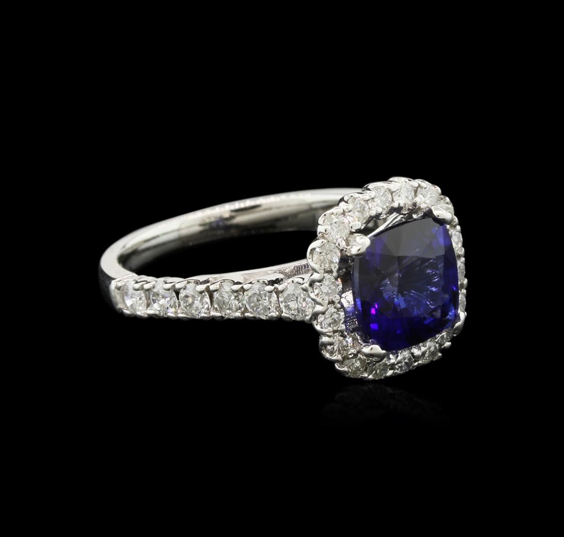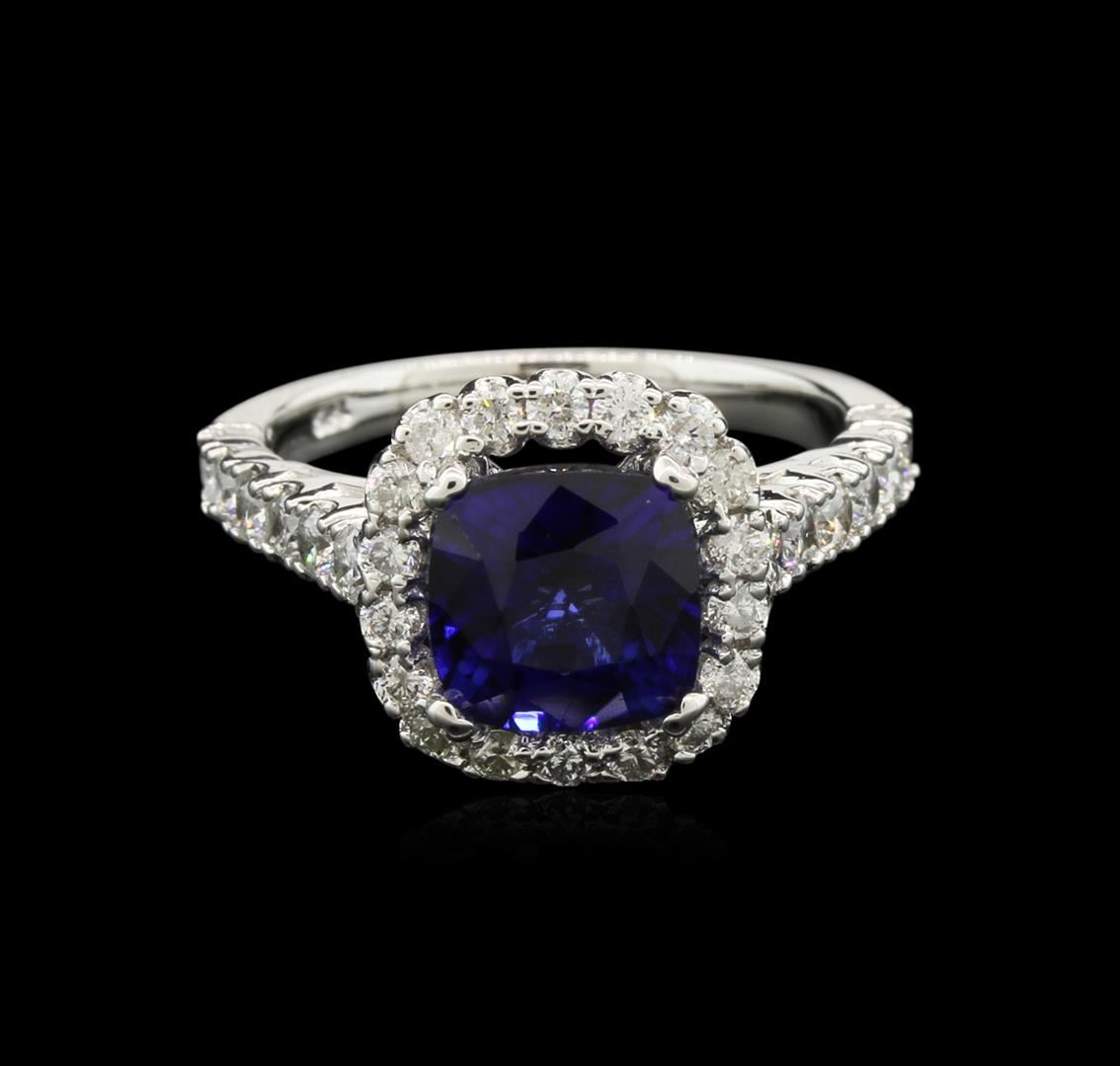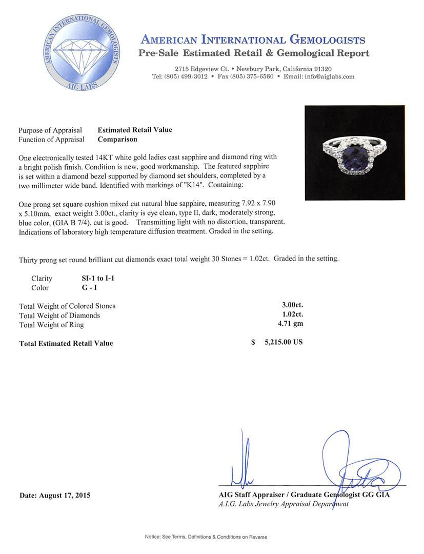 One electronically tested 14KT white gold ladies cast sapphire and diamond ring with a bright polish finish. The featured sapphire is set within a diamond bezel supported by diamond set shoulders, completed by a two millimeter wide band. Identified with markings of "K14". Condition is new, good workmanship. Containing: One prong set square cushion mixed cut natural blue sapphire, measuring 7.92 x 7.90 x 5.10mm, exact weight 3.00ct., clarity is eye clean, type II, dark, moderately strong, blue color, (GIA B 7/4), cut is good. Transmitting light with no distortion, transparent. Indications of laboratory high temperature diffusion treatment. Graded in the setting. Thirty prong set round brilliant cut diamonds exact total weight 30 Stones = 1.02ct. Graded in the setting. Clarity: SI-1 to I-1. Color: G - I. Total Weight of Colored Stones 3.00ct. Total Weight of Diamonds 1.02ct. Total Weight of Ring 4.71gm. AIG Appraised at $5,215.00.