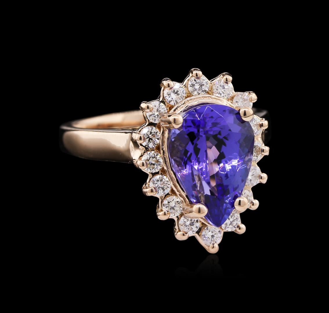 One electronically tested 14KT rose gold lady's cast fashion ring with a basket halo with a bright polish finish. The featured lady's ring has a shank measuring 2.25 millimeters wide. Identified with markings of "14K". Condition is new, good workmanship. Containing: One prong set pear modified brilliant cut natural tanzanite, measuring 11.13 x 7.88 x 5.69mm, approximate weight of 3.00ct., clarity is eye clean, type I, medium dark, moderately strong, violetish blue color, (GIA vB 6/4), cut is very good. Transmitting light with no distortion, transparent. Colored gemstones are presumed to have been subjected to commonly used enhancement processes. Graded in the setting. Sixteen prong set round brilliant cut diamonds, measuring 2.00 - 1.90 x 1.27mm (depth est.) approximate total weight of 16 Stones = 0.47ct. Graded in the setting. Clarity: SI-1 to I-1. Color: H - I. Cut Good. Total Weight of Colored Stones 3.00ct. Total Weight of Diamonds 0.47ct. Total Weight of Ring 6.00gm. GAS Appraised at $7,100.00.