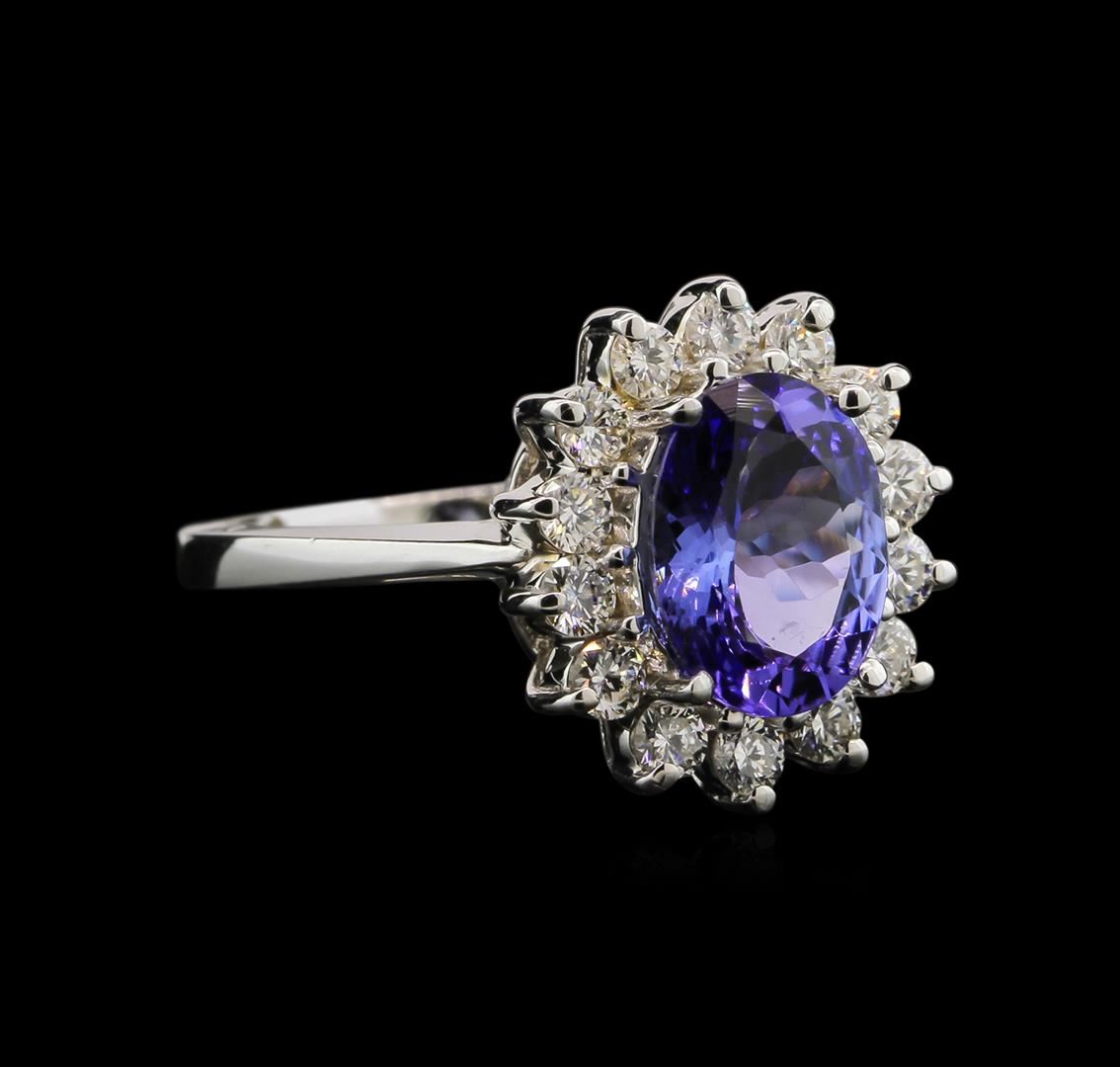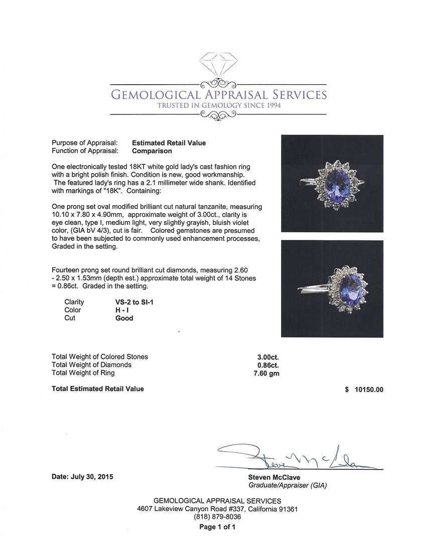 One electronically tested 18KT white gold lady's cast fashion ring with a bright polish finish. The featured lady's ring has a 2.1 millimeter wide shank. Identified with markings of "18K". Condition is new, good workmanship. Containing: One prong set oval modified brilliant cut natural tanzanite, measuring 10.10 x 7.80 x 4.90mm, approximate weight of 3.00ct., clarity is eye clean, type I, medium light, very slightly grayish, bluish violet color, (GIA bV 4/3), cut is fair. Colored gemstones are presumed to have been subjected to commonly used enhancement processes, Graded in the setting. Fourteen prong set round brilliant cut diamonds, measuring 2.60 - 2.50 x 1.53mm (depth est.) approximate. Total Weight of 14 Stones = 0.86ct. Graded in the setting. Clarity: VS-2 to SI-1. Color: H - I. Cut Good. Total Weight of Colored Stones 3.00ct. Total Weight of Diamonds 0.86ct. Total Weight of Ring 7.60gm. GAS Appraised at $10,150.00.