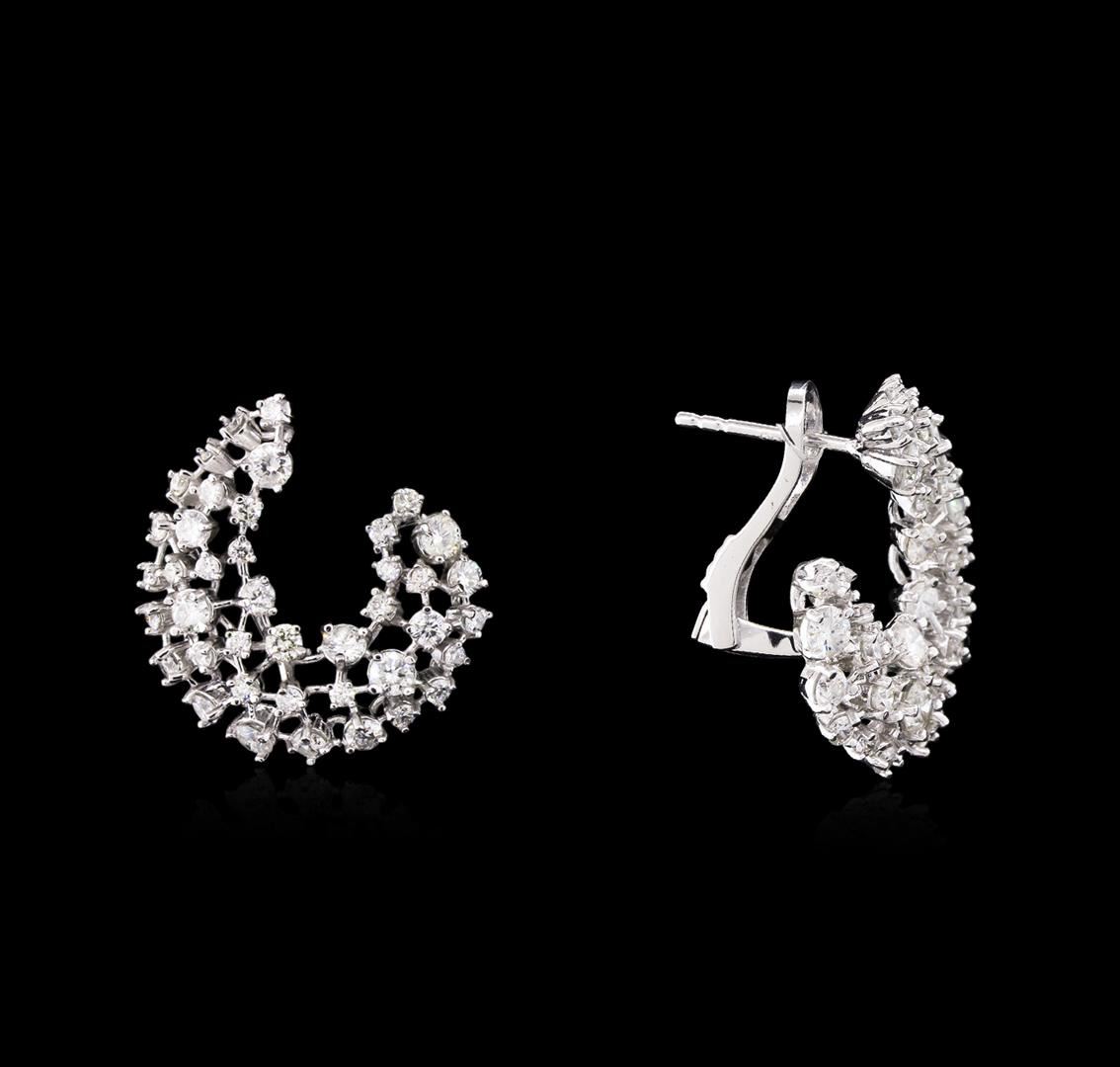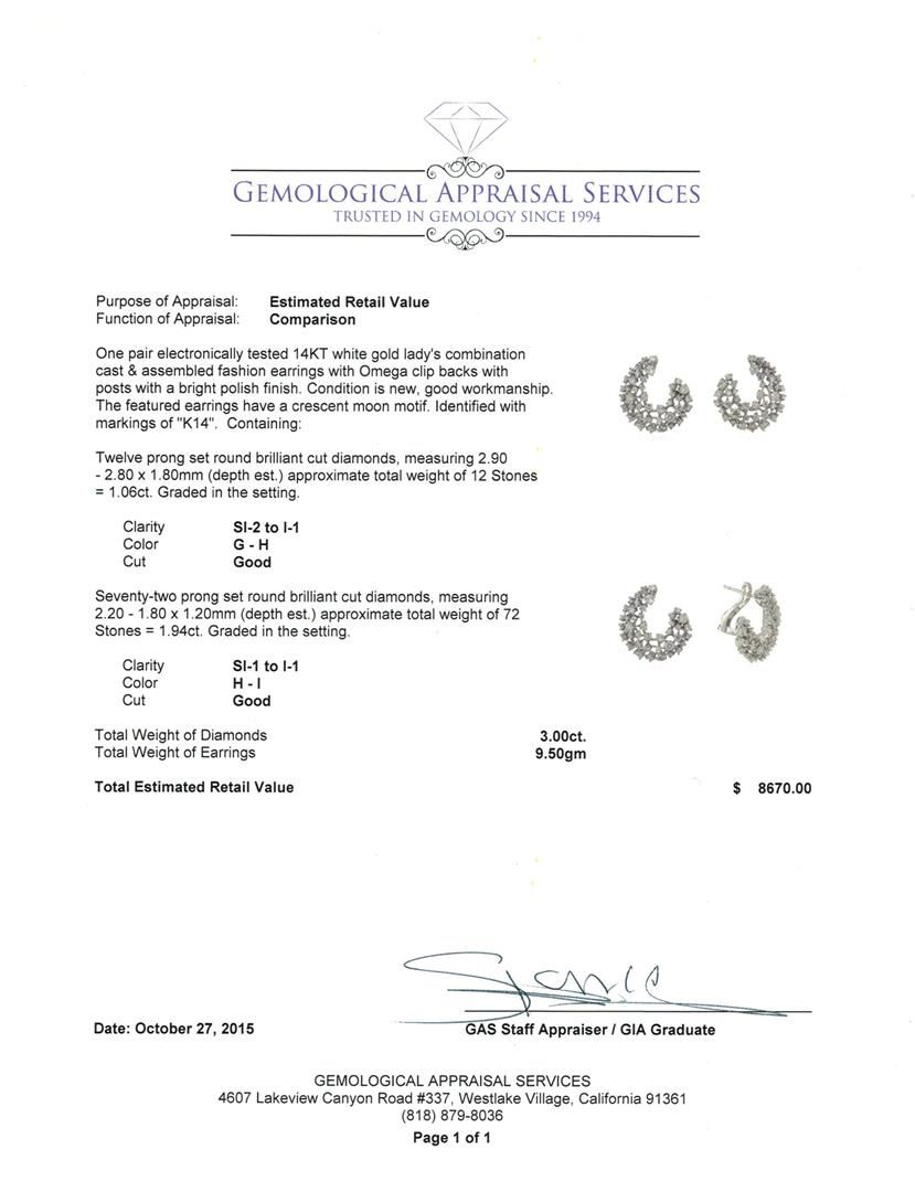 One pair electronically tested 14KT white gold lady's combination cast & assembled fashion earrings with Omega clip backs with posts with a bright polish finish. The featured earrings have a crescent moon motif. Identified with markings of "K14". Condition is new, good workmanship. Containing: Twelve prong set round brilliant cut diamonds, measuring 2.90 - 2.80 x 1.80mm (depth est.) approximate total weight of 12 Stones = 1.06ct. Graded in the setting. Clarity: SI-2 to I-1. Color: G - Good Seventy-Two prong set round brilliant cut diamonds, measuring 2.20 - 1.80 x 1.20mm (depth est.) approximate total weight of 72 Stones = 1.94ct. Graded in the setting. Clarity: SI-1 to I-1. Color: H - I. Cut Good. Total Weight of Diamonds 3.00ct. Total Weight of Earrings 9.50gm. GAS Appraised at $8,670.00.