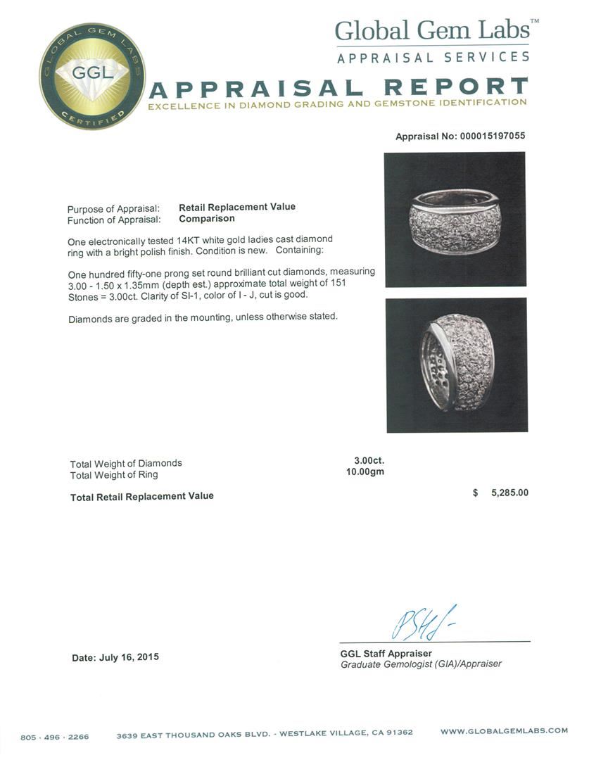 One electronically tested 14KT white gold ladies cast diamond ring with a bright polish finish. Condition is new. Containing: One Hundred Fifty-One prong set round brilliant cut diamonds, measuring 3.00 - 1.50 x 1.35mm (depth est.) approximate total weight of 151 Stones = 3.00ct. Clarity: SI-1. Color: I - J, Cut is Good. Diamonds are graded in the mounting, unless otherwise stated. Total Weight of Diamonds 3.00ct. Total Weight of Ring 10.00 grams. GGL Appraised at $5,285.00.