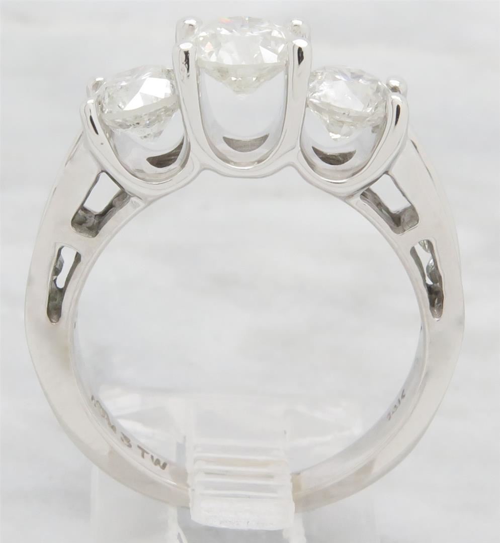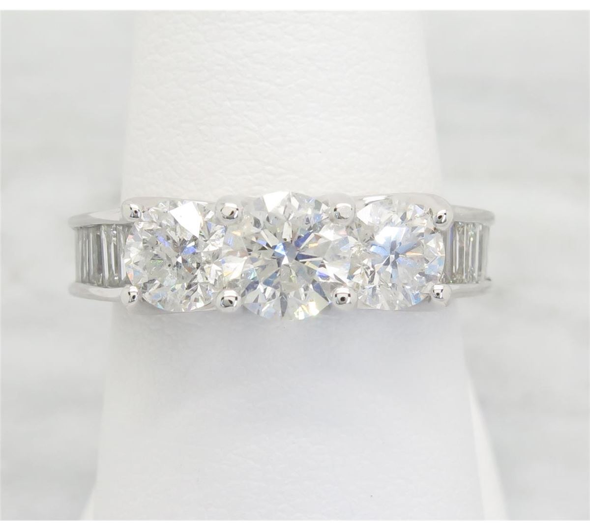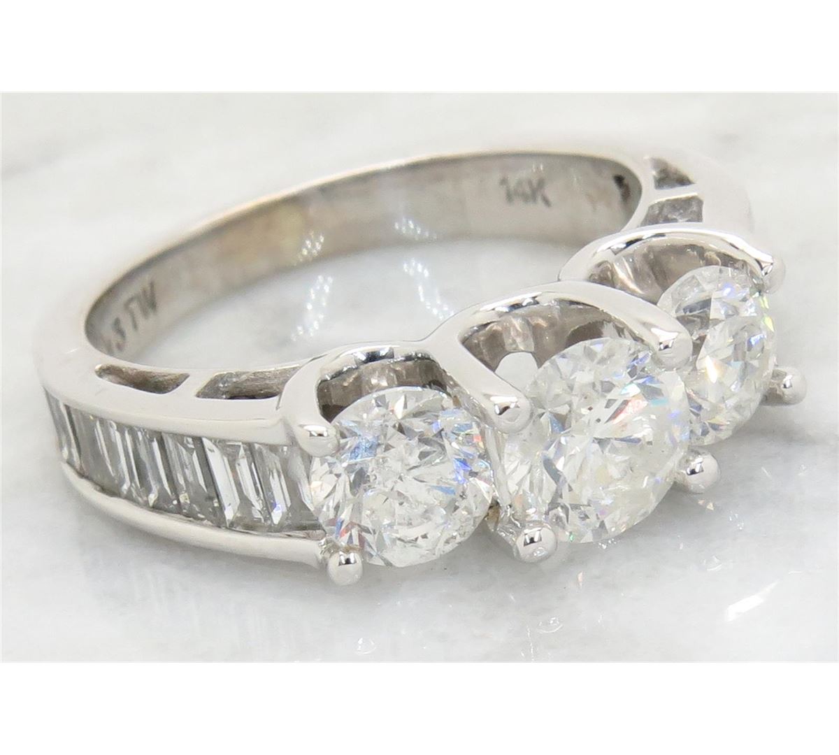 One tested 14K white gold diamond ring. Containing: One Round Brilliant Cut Diamond, Approximate Size: .82CT, Clarity: I, Color: H-I. 2 Round Brilliant Cut Diamonds, 14 Baguette Cut Diamonds. Approximate total diamond weight: 3.00CTW. All diamonds are graded in the mounting unless otherwise stated. Weight of ring: 5.3 grams, Size: 6.5.