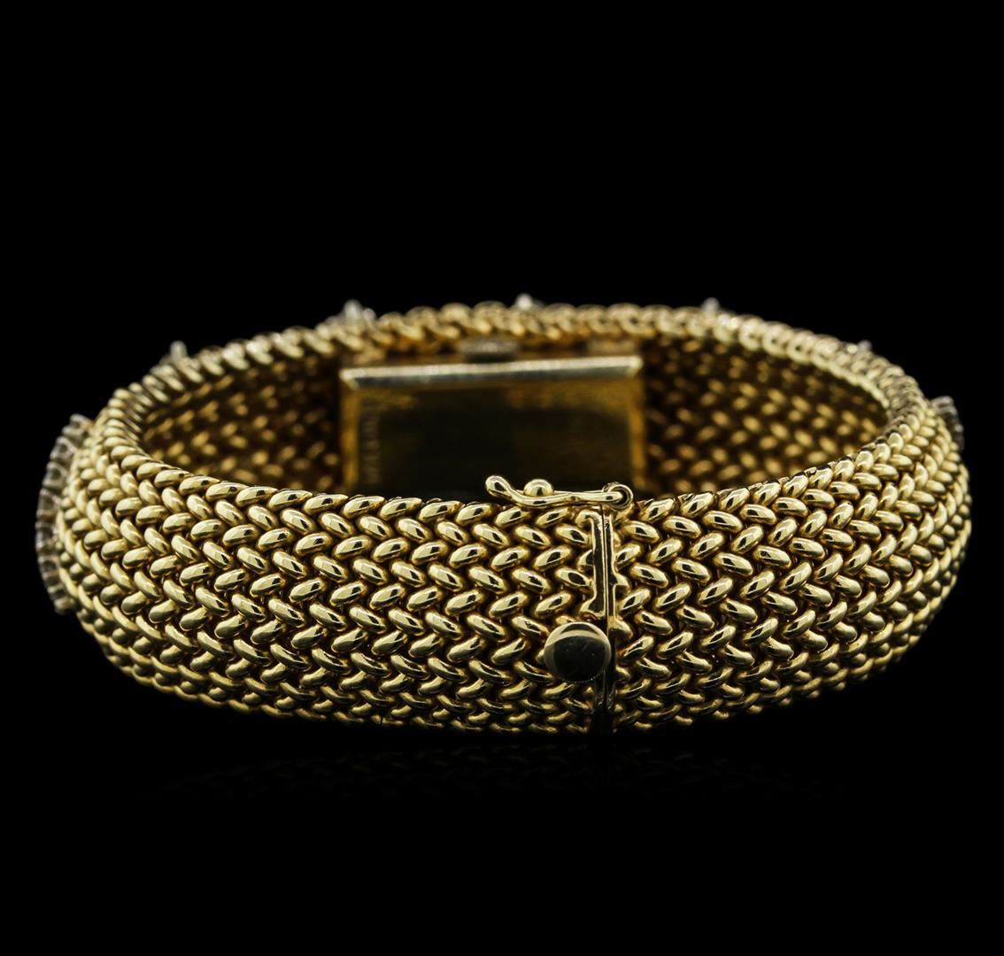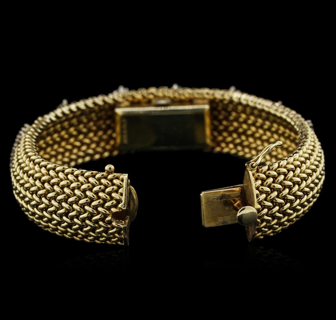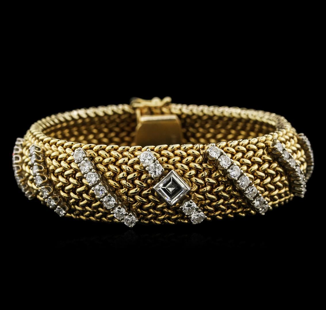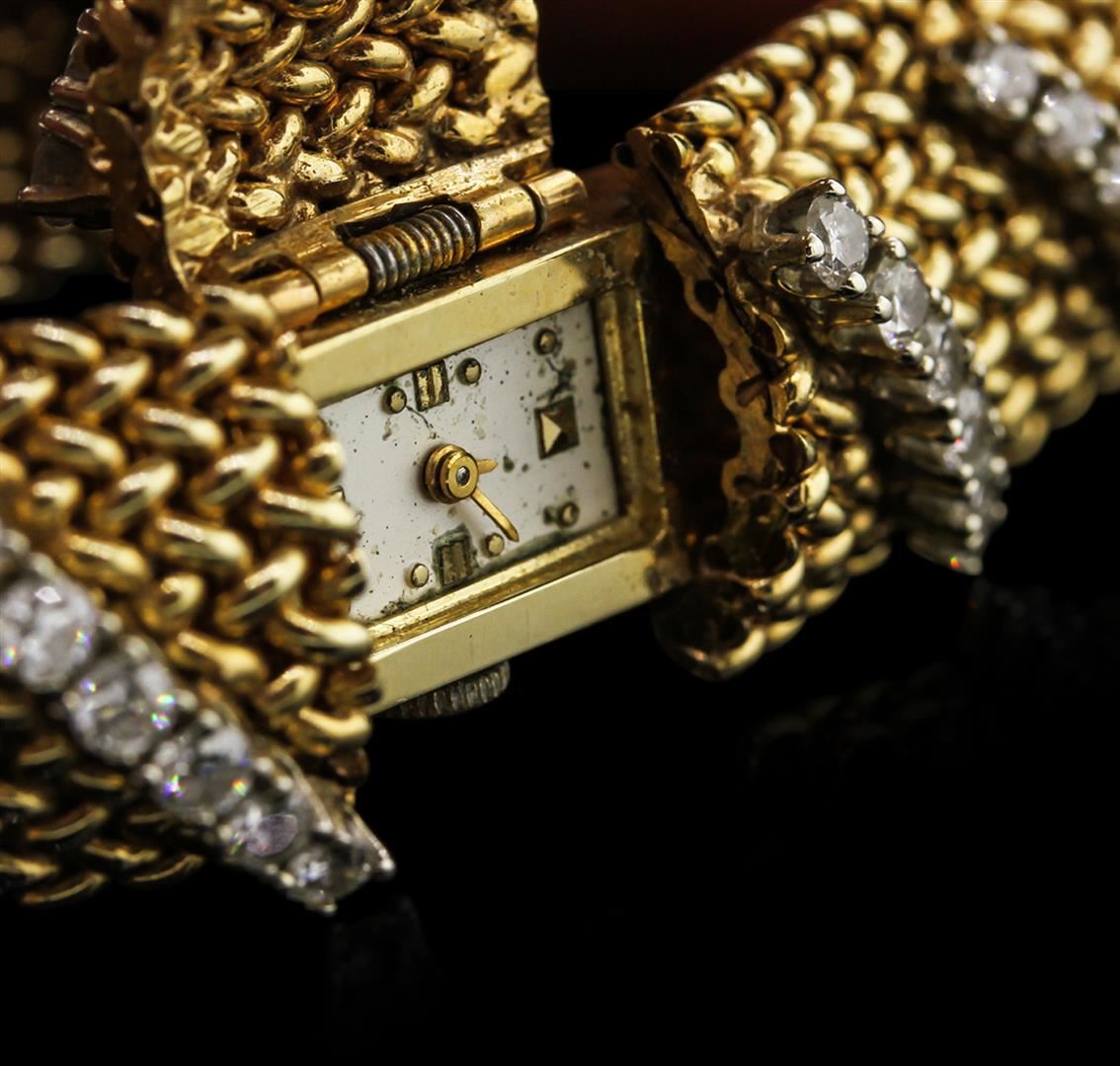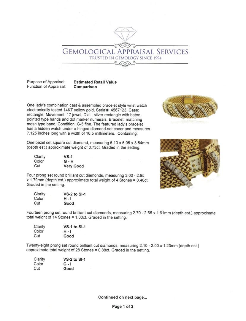 One lady's, combination cast & assembled bracelet style wrist watch electronically tested 14KT yellow gold, Serial#: 4567123, Case: rectangle, Movement: 17 jewel, Dial: silver rectangle with baton, pointed type hands and dot marker numerals, Bracelet: matching mesh type band, Condition: G-5 fine. The featured lady's bracelet has a hidden watch under a hinged diamond-set cover and measures 7.125 inches long with a width of 16.5 millimeters. Containing: One bezel set square cut diamond, measuring 5.10 x 5.05 x 3.54mm (depth est.) approximate weight of 0.73ct. Graded in the setting. Clarity: VS-1. Color: G - H. Cut Very Good Four prong set round brilliant cut diamonds, measuring 3.00 - 2.95 x 1.79mm (depth est.) approximate total weight of 4 Stones = 0.40ct. Graded in the setting. Clarity: VS-2 to SI-1. Color: H - I. Cut Good Fourteen prong set round brilliant cut diamonds, measuring 2.70 - 2.65 x 1.61mm (depth est.) approximate total weight of 14 Stones = 1.00ct. Graded in the setting. Clarity: VS-1 to SI-1. Color: H - I. Cut Good Twenty-Eight prong set round brilliant cut diamonds, measuring 2.10 - 2.00 x 1.23mm (depth est.) approximate total weight of 28 Stones = 0.88ct. Graded in the setting. Clarity: VS-2 to SI-1. Color: G - I. Cut Good. Total Weight of Diamonds 3.01ct. Total Weight of Watch 57.90gm. GAS Appraised at $20,425.00.