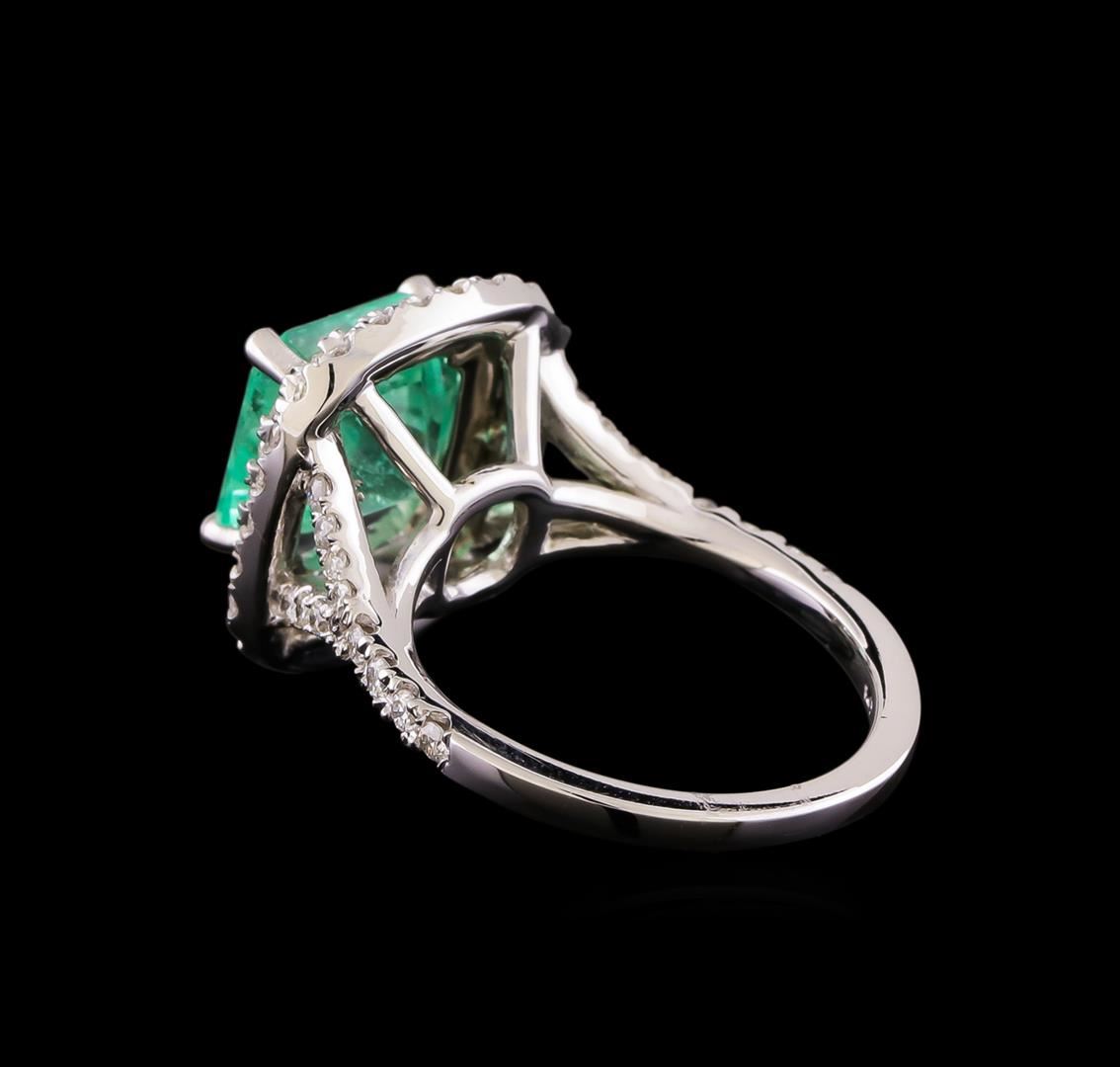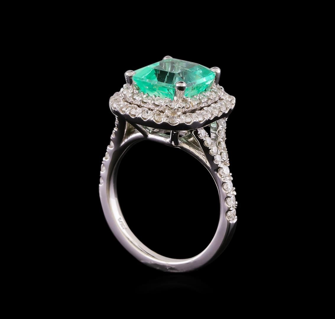 One electronically tested 14KT white gold lady's cast fashion ring with a split shank double halo with a bright polish finish. The featured lady's ring has a shank measuring 1.75 millimeters wide. Identified with markings of "14K". Condition is new, good workmanship. Containing: One prong set square step cut natural emerald, measuring 9.02 x 8.65 x 6.14mm, (depth est.) approximate weight of 3.01ct., clarity is slightly included, medium light, moderately strong, green color, (GIA G 4/4), cut is very good. Transmitting light with a minimum of distortion, transparent. Indications of oil residue. Naturally occurring internal & external characteristics are present. Colored gemstones are presumed to have been subjected to commonly used enhancement processes. Graded in the setting. Thirty-Four prong set round brilliant cut diamonds, measuring 1.65 - 1.55 x 0.99mm (depth est.) approximate total weight of 34 Stones = 0.52ct. Graded in the setting. Clarity: SI-1 to SI-2. Color: H - I. Cut Good Thirty-Six prong set round brilliant cut diamonds, measuring 1.40 - 1.35 x 0.86mm (depth est.) approximate total weight of 36 Stones = 0.36ct. Graded in the setting. Clarity: SI-1 to SI-2. Color: G - Good. Total Weight of Colored Stones 3.01ct. Total Weight of Diamonds 0.88ct. Total Weight of Ring 5.90gm. GAS Appraised at $11,455.00.