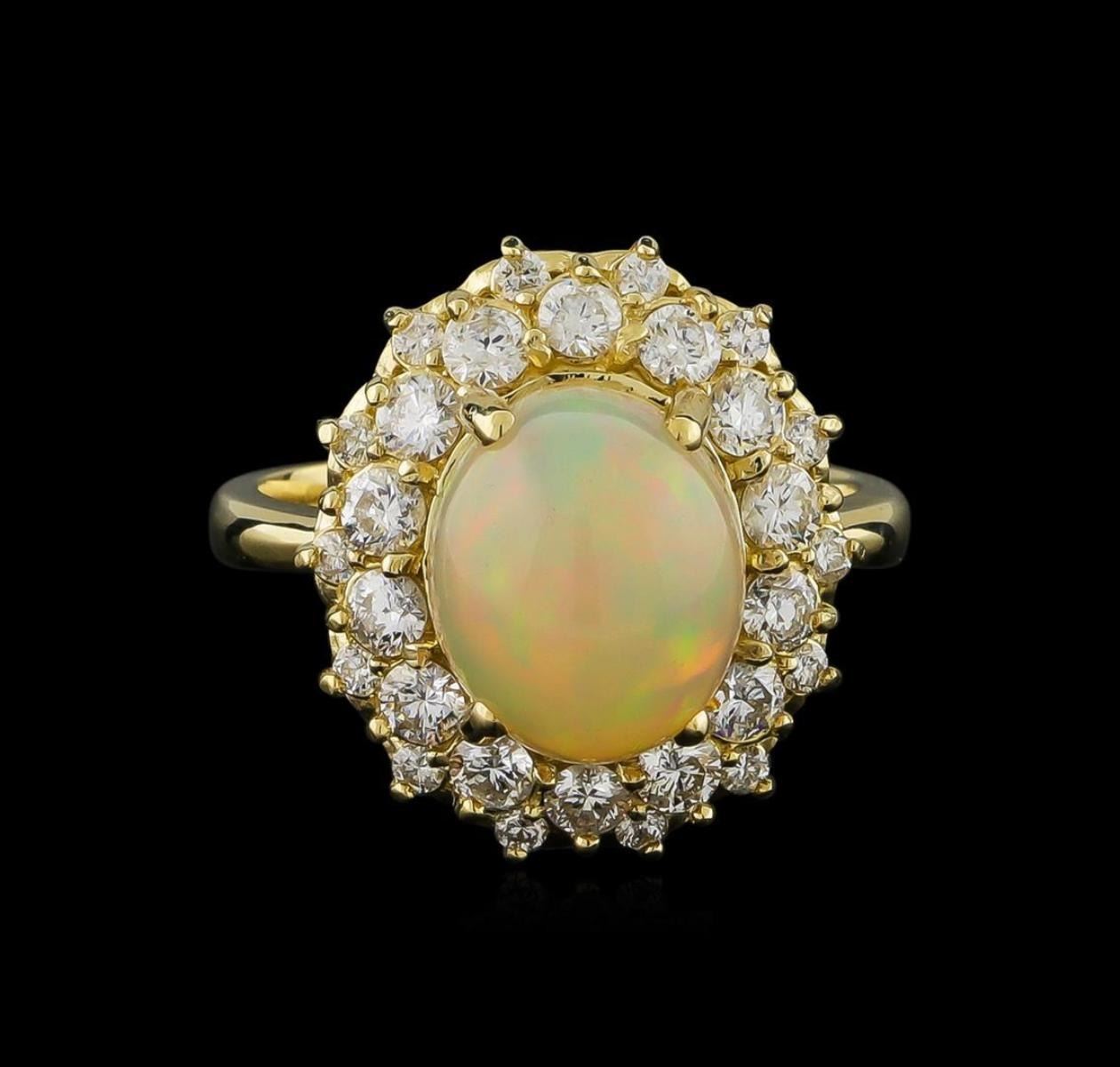 One electronically tested 14KT yellow gold lady's cast fashion ring with a double basket halo with a bright polish finish. The featured lady's ring has a shank measuring 2.86 millimeters wide. Identified with markings of "K14". Condition is new, good workmanship. Containing: One crystal opal that is cut in a oval shaped cabochon and is prong set, measuring 11.00 mm long x 9.19 mm wide, and 6.38 mm thick and the approximate weight is 3.01 carats. The opal has a bright, green-orange play of color (fire) in a rolling flashfire pattern; a high dome; a good cut; no inclusions; consistent in its brightness and pattern; and is not directional. Graded in the setting. Fourteen prong set round brilliant cut diamonds, measuring 2.80 - 2.70 x 1.65mm (depth est.) approximate total weight of 14 Stones = 1.06ct. Graded in the setting. Clarity: SI-1 to SI-2. Color: G - Good Fourteen prong set round brilliant cut diamonds, measuring 1.60 - 1.55 x 0.98mm (depth est.) approximate total weight of 14 Stones = 0.21ct. Graded in the setting. Clarity: SI-1 to SI-2. Color: H - I. Cut Good. Total Weight of Diamonds 1.27ct. Total Weight of Opals 3.01ct. Total Weight of Ring 6.80gm. GAS Appraised.