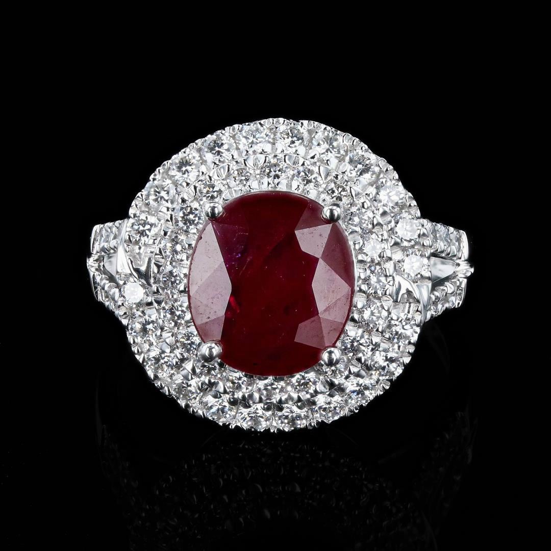 One polished, stamped, and tested platinum ring marked Aaron Gottlieb. The ring is mounted with: 1 genuine GIA certified ruby center stone weighing 3.01 carats, and 58 genuine round diamonds weighing approximately 0.95 carats. This item weighs 7.2 grams, condition is new, excellent workmanship. #MAIN GEMSTONE# GIA Report No.: 2235396211 Species: Natural Corundum Variety: Ruby Shape: Oval Cutting Style: Brilliant Cut Crown, Step Cut Pavilion Measurements: 9.27 x 8.30 x 3.80mm Weight: 3.01 carats Color: Red Transparency: Transparent to Semi Transparent Treatment: Heat with Residues Refractive Index: 1.762 - 1.770 DR Birefringence: 0.008 - 0.010 Hardness: 9 #ADJACENT GEMSTONES ON RING# Identity: Natural Diamond Shape: Round Cutting Style: Brilliant Cut Quantity: 58 Diamonds Measurements: 1.5 - 1.7mm Total Weight: 0.95 carats Clarity Grade: VS2-SI1 Color Grade: F-G Refractive Index: 2.417 Hardness: 10 RUBY WEIGHT: 3.01 ct TOTAL DIAMOND WEIGHT: 0.95 cts WEIGHT OF ITEM: 7.2 grams METAL: Platinum Size: 7