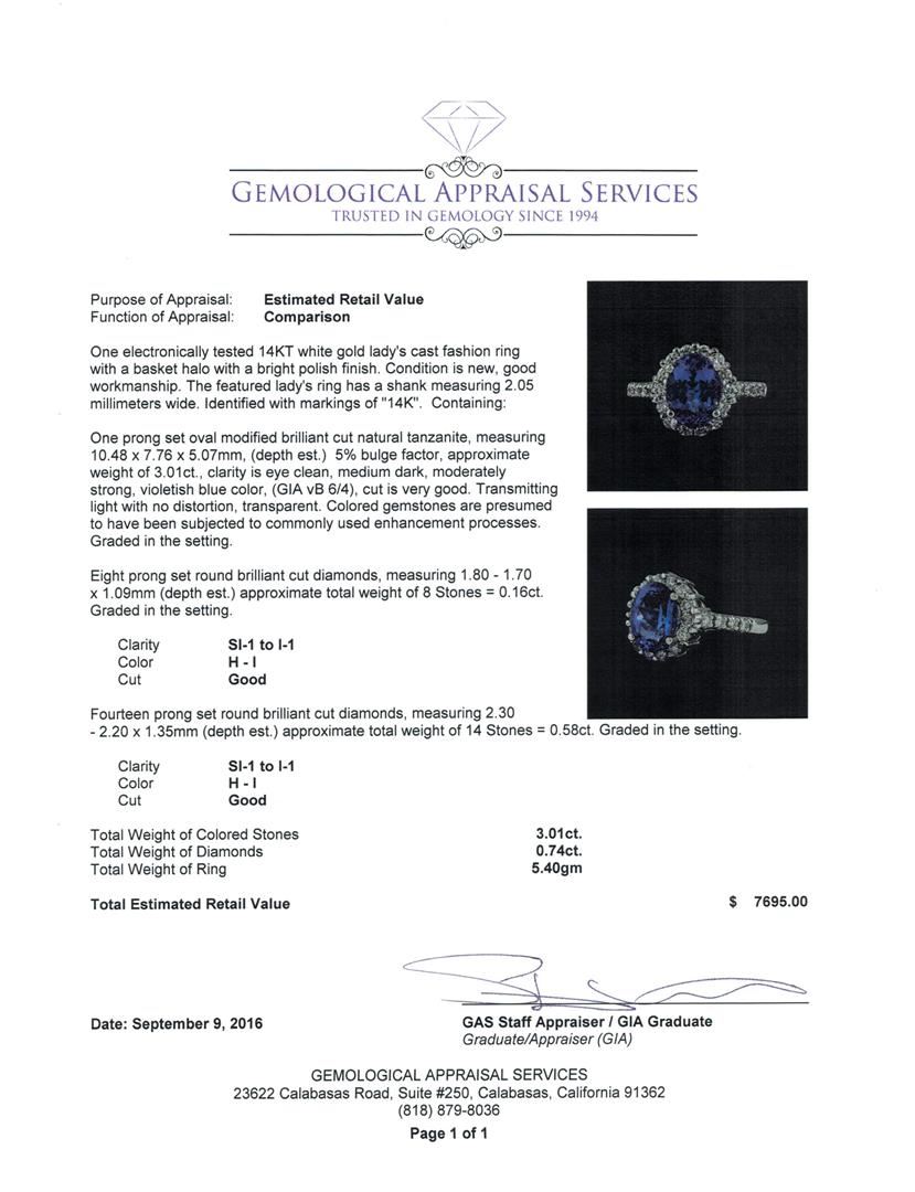 One electronically tested 14KT white gold lady's cast fashion ring with a basket halo with a bright polish finish. The featured lady's ring has a shank measuring 2.05 millimeters wide. Identified with markings of '14K'. Condition is new, good workmanship. Containing: One prong set oval modified brilliant cut natural tanzanite, measuring 10.48 x 7.76 x 5.07mm, (depth est.) 5%. bulge factor, approximate weight of 3.01ct., clarity is eye clean, medium dark, moderately strong, violetish blue color, (GIA vB 6/4), cut is very good. Transmitting light with no distortion, transparent. Colored gemstones are presumed to have been subjected to commonly used enhancement processes. Graded in the setting. Eight prong set round brilliant cut diamonds, measuring 1.80 - 1.70 x 1.09mm (depth est.) approximate total weight of 8 Stones = 0.16ct. Graded in the setting. Clarity SI-1 to I-1. Color: H - I Cut Good Fourteen prong set round brilliant cut diamonds, measuring 2.30 - 2.20 x 1.35mm (depth est.) approximate total weight of 14 Stones = 0.58ct. Graded in the setting. Clarity SI-1 to I-1. Color: H - I Cut Good. Total Weight of Colored Stones 3.01ct.. Total Weight of Diamonds 0.74ct.. Total Weight of Ring 5.40gm GAS Appraised at $7,695.00.