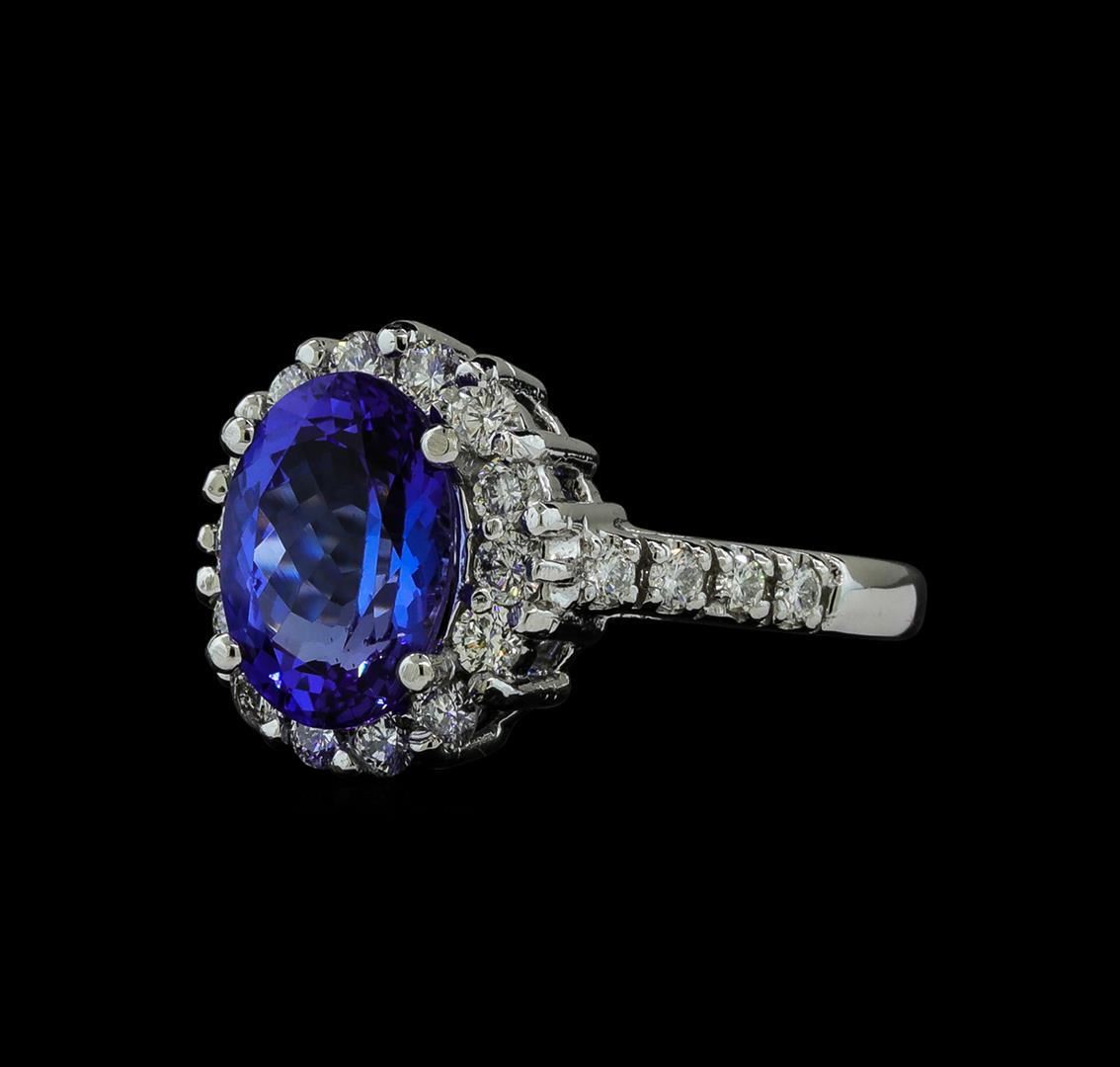 One electronically tested 14KT white gold lady's cast fashion ring with a basket halo with a bright polish finish. The featured lady's ring has a shank measuring 2.05 millimeters wide. Identified with markings of '14K'. Condition is new, good workmanship. Containing: One prong set oval modified brilliant cut natural tanzanite, measuring 10.48 x 7.76 x 5.07mm, (depth est.) 5%. bulge factor, approximate weight of 3.01ct., clarity is eye clean, medium dark, moderately strong, violetish blue color, (GIA vB 6/4), cut is very good. Transmitting light with no distortion, transparent. Colored gemstones are presumed to have been subjected to commonly used enhancement processes. Graded in the setting. Eight prong set round brilliant cut diamonds, measuring 1.80 - 1.70 x 1.09mm (depth est.) approximate total weight of 8 Stones = 0.16ct. Graded in the setting. Clarity SI-1 to I-1. Color: H - I Cut Good Fourteen prong set round brilliant cut diamonds, measuring 2.30 - 2.20 x 1.35mm (depth est.) approximate total weight of 14 Stones = 0.58ct. Graded in the setting. Clarity SI-1 to I-1. Color: H - I Cut Good. Total Weight of Colored Stones 3.01ct.. Total Weight of Diamonds 0.74ct.. Total Weight of Ring 5.40gm