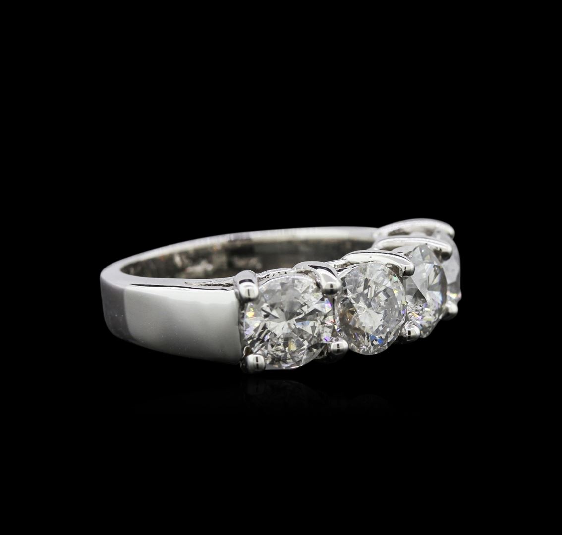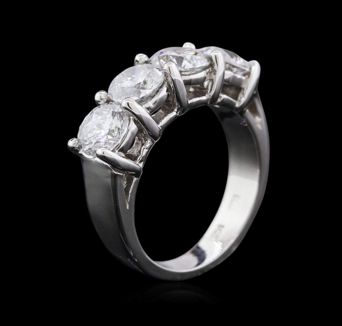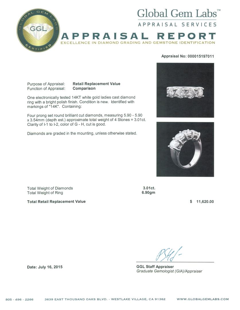 One electronically tested 14KT white gold ladies cast diamond ring with a bright polish finish. Identified with markings of "14K". Condition is new. Containing: Four prong set round brilliant cut diamonds, measuring 5.90 - 5.90 x 3.54mm (depth est.) approximate total weight of 4 Stones = 3.01ct. Clarity: I-1 to I-2. Color: G - H, Cut is Good. Diamonds are graded in the mounting, unless otherwise stated. Total Weight of Diamonds 3.01ct. Total Weight of Ring 6.90 grams. GGL Appraised at $11,620.00.