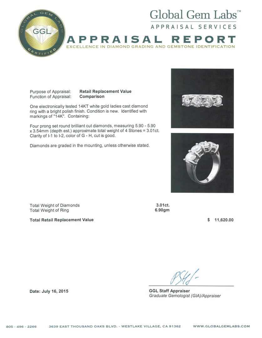 One electronically tested 14KT white gold ladies cast diamond ring with a bright polish finish. Identified with markings of "14K". Condition is new. Containing: Four prong set round brilliant cut diamonds, measuring 5.90 - 5.90 x 3.54mm (depth est.) approximate total weight of 4 Stones = 3.01ct. Clarity: I-1 to I-2. Color: G - H, Cut is Good. Diamonds are graded in the mounting, unless otherwise stated. Total Weight of Diamonds 3.01ct. Total Weight of Ring 6.90 grams. GGL Appraised at $11,620.00.