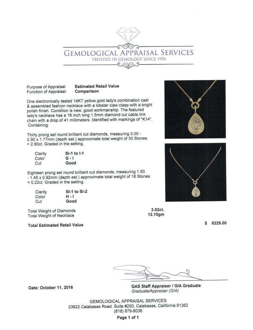 One electronically tested 14KT yellow gold lady's combination cast & assembled fashion necklace with a lobster claw clasp with a bright polish finish. The featured lady's necklace has a 16 inch long 1.5mm diamond cut cable link chain with a drop of 41 millimeters. Identified with markings of 'K14'. Condition is new, good workmanship. Containing: Thirty prong set round brilliant cut diamonds, measuring 3.00 - 2.90 x 1.77mm (depth est.) approximate total weight of 30 Stones = 2.80ct. Graded in the setting. Clarity SI-1 to I-1. Color: G - I Cut Good Eighteen prong set round brilliant cut diamonds, measuring 1.50 - 1.45 x 0.92mm (depth est.) approximate total weight of 18 Stones = 0.22ct. Graded in the setting. Clarity SI-1 to SI-2. Color: H - I Cut Good. Total Weight of Diamonds 3.02ct.. Total Weight of Necklace 12.10gm. GAS Appraised at $8,225.00.