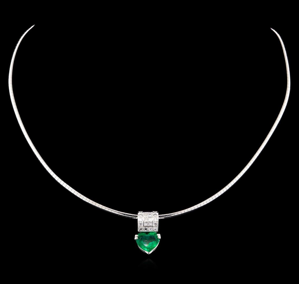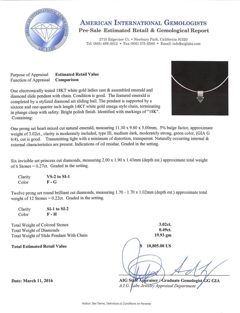 One electronically tested 18KT white gold ladies cast & assembled emerald and diamond slide pendant with chain. The featured emerald is completed by a stylized diamond set sliding bail. The pendant is supported by a sixteen and one-quarter inch length 14KT white gold omega style chain, terminating in plunge clasp with safety. Bright polish finish. Identified with markings of "18K". Condition is good. Containing: One prong set heart mixed cut natural emerald, measuring 11.30 x 9.60 x 5.00mm, 5%. bulge factor, approximate weight of 3.02ct., clarity is moderately included, type III, medium dark, moderately strong, green color, (GIA G 6/4), cut is good. Transmitting light with a minimum of distortion, transparent. Naturally occurring internal & external characteristics are present. Indications of oil residue. Graded in the setting. Six invisible set princess cut diamonds, measuring 2.00 x 1.90 x 1.43mm (depth est.) approximate total weight of 6 Stones = 0.27ct. Graded in the setting. Clarity: VS-2 to SI-1. Color: F - G Twelve prong set round brilliant cut diamonds, measuring 1.70 - 1.70 x 1.02mm (depth est.) approximate total weight of 12 Stones = 0.22ct. Graded in the setting. Clarity: SI-1 to SI-2. Color: F - H. Total Weight of Colored Stones 3.02ct. Total Weight of Diamonds 0.49ct. Total Weight of Slide Pendant With Chain 19.93gm. AIG Appraised at $10,805.00.