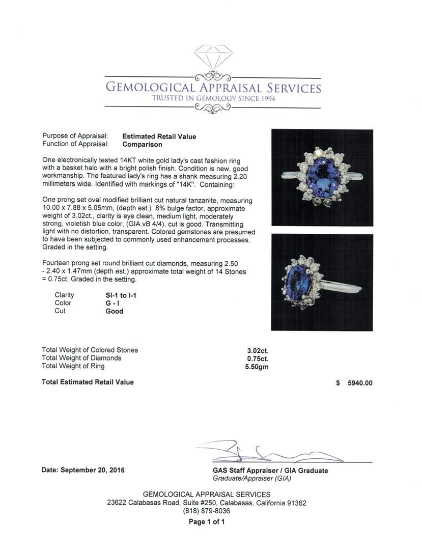 One electronically tested 14KT white gold lady's cast fashion ring with a basket halo with a bright polish finish. The featured lady's ring has a shank measuring 2.20 millimeters wide. Identified with markings of '14K'. Condition is new, good workmanship. Containing: One prong set oval modified brilliant cut natural tanzanite, measuring 10.00 x 7.88 x 5.05mm, (depth est.) 8%. bulge factor, approximate weight of 3.02ct., clarity is eye clean, medium light, moderately strong, violetish blue color, (GIA vB 4/4), cut is good. Transmitting light with no distortion, transparent. Colored gemstones are presumed to have been subjected to commonly used enhancement processes. Graded in the setting. Fourteen prong set round brilliant cut diamonds, measuring 2.50 - 2.40 x 1.47mm (depth est.) approximate total weight of 14 Stones = 0.75ct. Graded in the setting. Clarity SI-1 to I-1. Color: G - I Cut Good. Total Weight of Colored Stones 3.02ct.. Total Weight of Diamonds 0.75ct.. Total Weight of Ring 5.50gm. GAS Appraised at $5,940.00.