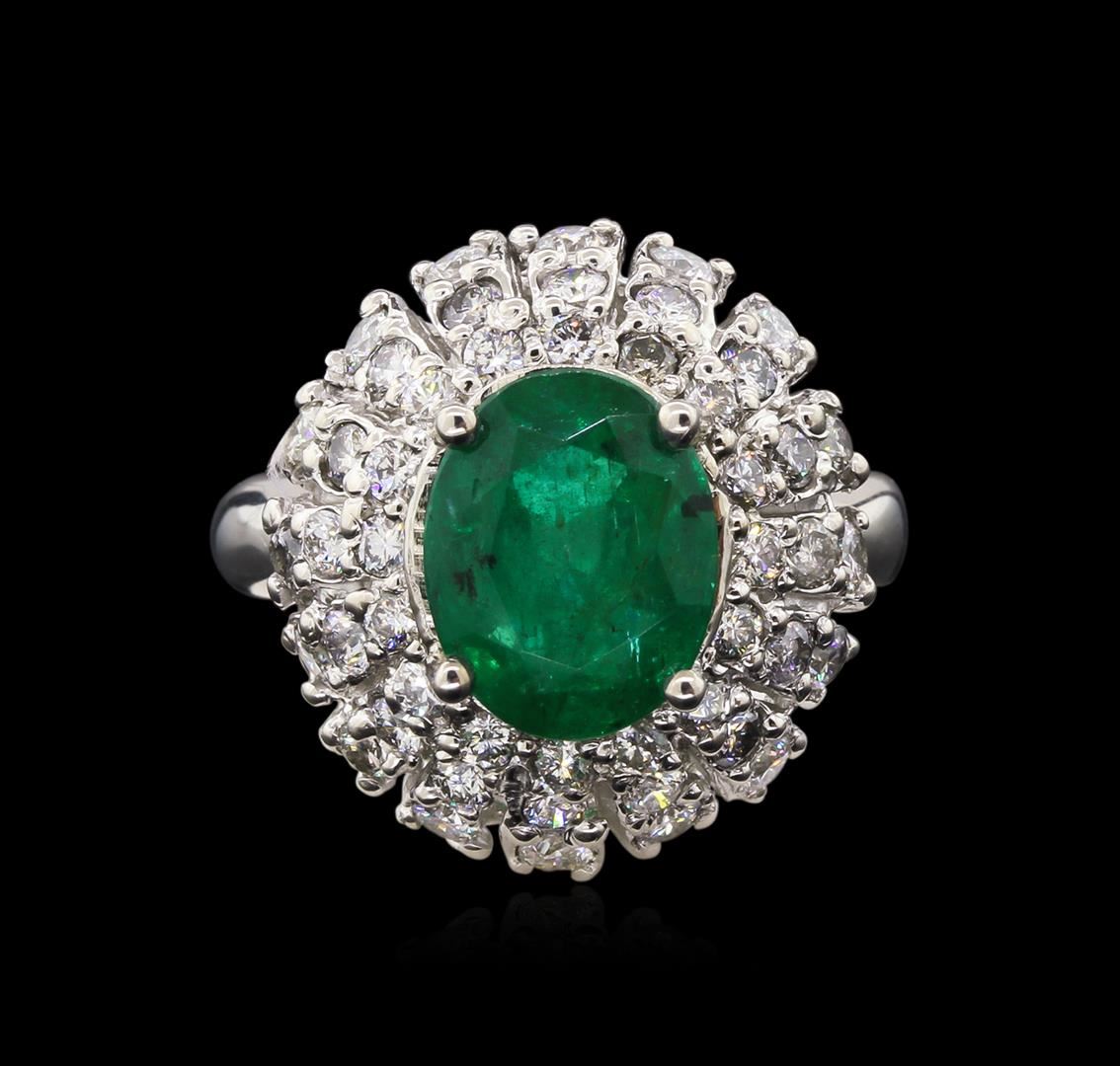 One electronically tested 14KT white gold lady's cast fashion ring with a bright polish finish. The featured ring has a domed basket halo motif and a shank measuring 2.55 millimeters in width. Identified with markings of "14K". Condition is new, good workmanship. Containing: One prong set oval modified brilliant cut natural emerald, measuring 10.12 x 8.00 x 5.60mm, 15% bulge factor, approximate weight of 3.02ct., clarity is heavily included, type III, medium dark, moderately strong, green color, (GIA G 6/4), cut is good. Transmitting light somewhat diffusely, semi-transparent to translucent. Indications of oil residue. Naturally occurring internal & external characteristics are present. Graded in the setting. Sixteen prong set round brilliant cut diamonds, measuring 2.20 - 2.10 x 1.40mm (depth est.) approximate total weight of 16 Stones = 0.63ct. Graded in the setting. Clarity: SI-1 to SI-2. Color: H - I. Cut Good Thirty-Two prong set round brilliant cut diamonds, measuring 1.90 - 1.70 x 1.08mm (depth est.) approximate total weight of 32 Stones = 0.60ct. Graded in the setting. Clarity: SI-1 to SI-2. Color: H - I. Cut Good. Total Weight of Colored Stones 3.02ct. Total Weight of Diamonds 1.23ct. Total Weight of Ring 7.70gm. GAS Appraised at $7,495.00.