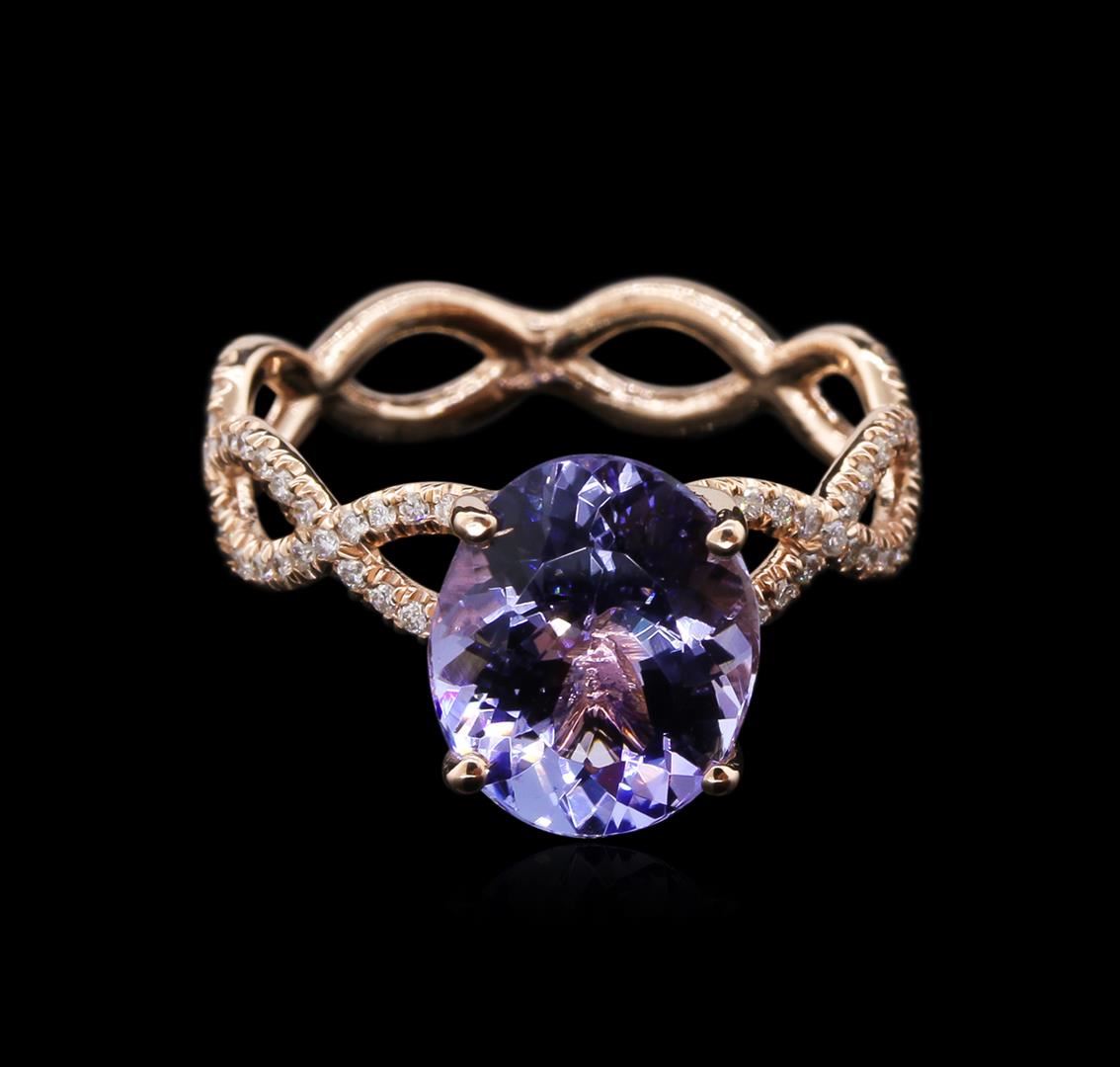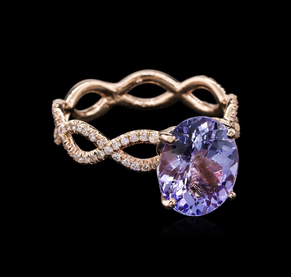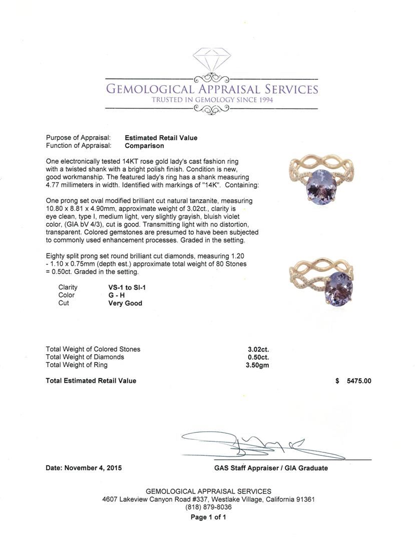 One electronically tested 14KT rose gold lady's cast fashion ring with a twisted shank with a bright polish finish. The featured lady's ring has a shank measuring 4.77 millimeters in width. Identified with markings of "14K". Condition is new, good workmanship. Containing: One prong set oval modified brilliant cut natural tanzanite, measuring 10.80 x 8.81 x 4.90mm, approximate weight of 3.02ct., clarity is eye clean, type I, medium light, very slightly grayish, bluish violet color, (GIA bV 4/3), cut is good. Transmitting light with no distortion, transparent. Colored gemstones are presumed to have been subjected to commonly used enhancement processes. Graded in the setting. Eighty split prong set round brilliant cut diamonds, measuring 1.20 - 1.10 x 0.75mm (depth est.) approximate total weight of 80 Stones = 0.50ct. Graded in the setting. Clarity: VS-1 to SI-1. Color: G - Very Good. Total Weight of Colored Stones 3.02ct. Total Weight of Diamonds 0.50ct. Total Weight of Ring 3.50gm GAS Appraised at $5,475.00.