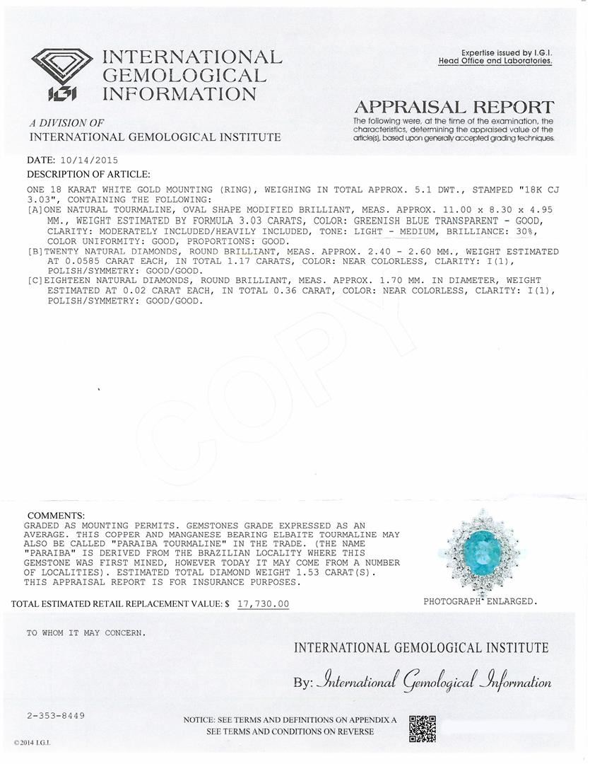 One 18KT white gold ring, weighing in total approx. 5.1 dwt., stamped "18K CJ 3.03", containing the following: One natural paraiba tourmaline, oval shape modified brilliant, measuring approx. 11.00 x 8.30 x 4.95 mm, weight estimated by formula 3.03ct, color: greenish blue transparent - good, color uniformity: good, proportions: good. Twenty natural diamonds, round brilliant, measuring approx. 2.40 - 2.60 mm, weight estimated at 0.0585ct each, in total 1.17ct, color: near colorless, clarity: I1, polish/symmetry: good/good. Eighteen natural diamonds, round brilliant, measuring approx. 1.70 mm in diameter, weight estimated at 0.02ct each, in total 0.36ct, color: near colorless, clarity: I1, polish/symmetry: good/good. IGI Appraised at $17,730.00.