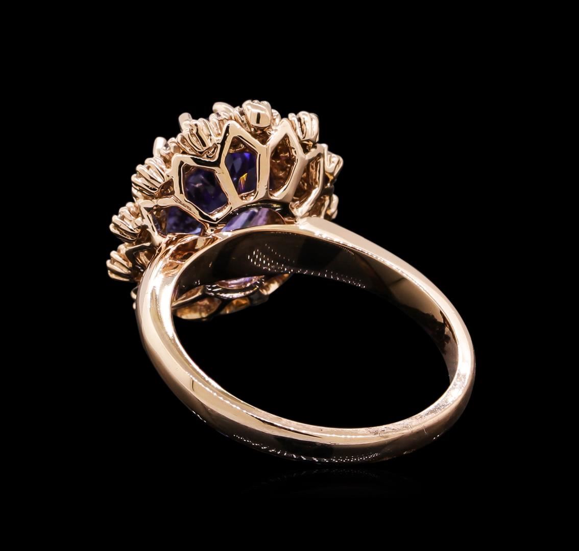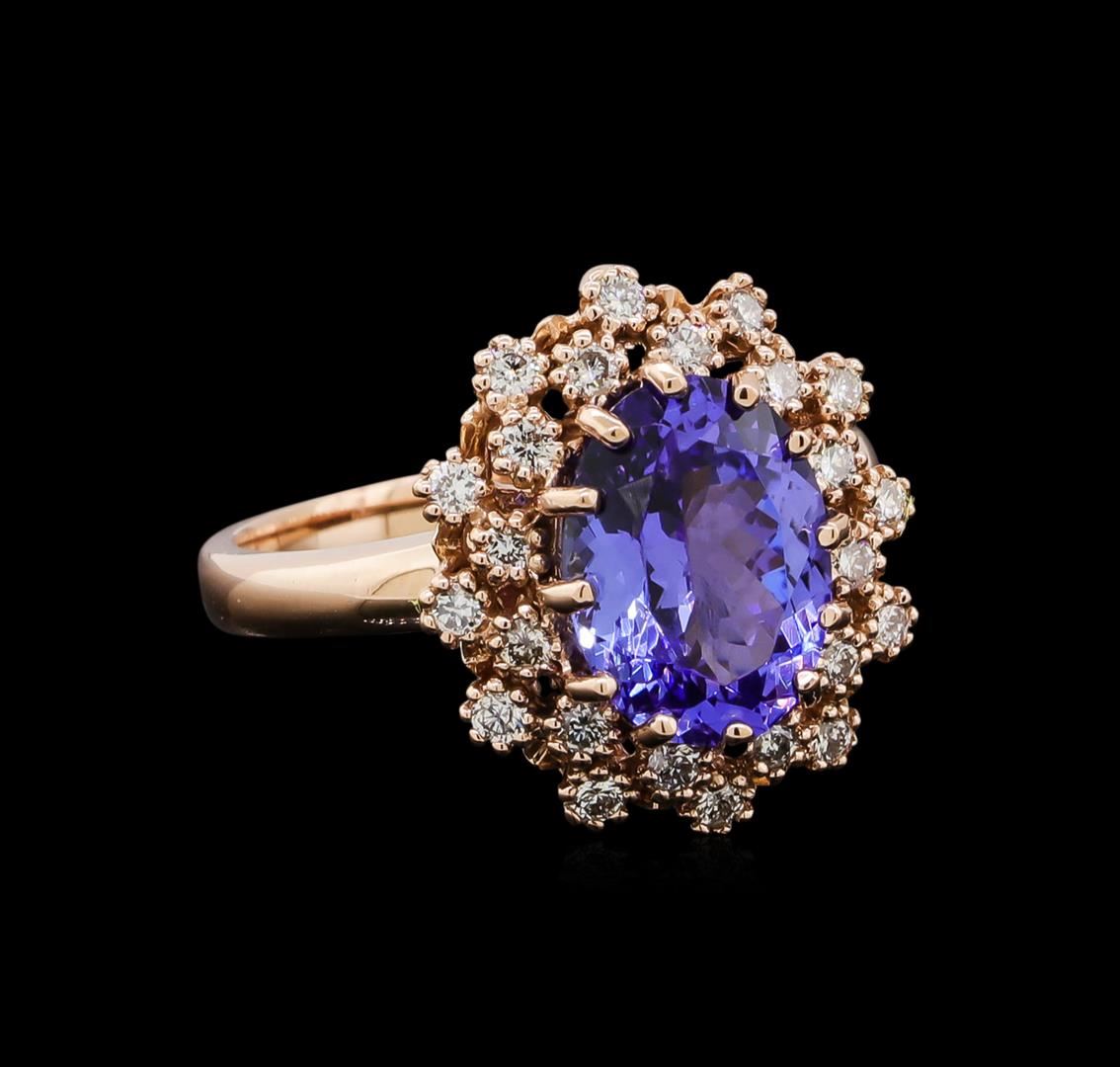 One electronically tested 14KT rose gold lady's cast fashion ring with a double basket halo with a bright polish finish. The featured lady's ring has a shank measuring 2.31 millimeters in width. Identified with markings of 'K14'. Condition is new, good workmanship. Containing: One prong set oval modified brilliant cut natural tanzanite, measuring 10.80 x 8.40 x 4.90mm, (depth est.) approximate weight of 3.03ct., clarity is eye clean, medium, moderately strong, bluish violet color, (GIA bV 5/4), cut is very good. Transmitting light with no distortion, transparent. Colored gemstones are presumed to have been subjected to commonly used enhancement processes. Graded in the setting. Twenty-Four prong set round brilliant cut diamonds, measuring 1.75 - 1.70 x 1.04mm (depth est.) approximate total weight of 24 Stones = 0.45ct. Graded in the setting. Clarity SI-1 to SI-2. Color: H - I Cut Good. Total Weight of Colored Stones 3.03ct.. Total Weight of Diamonds 0.45ct.. Total Weight of Ring 5.80gm. GAS Appraised at $6,720.00.