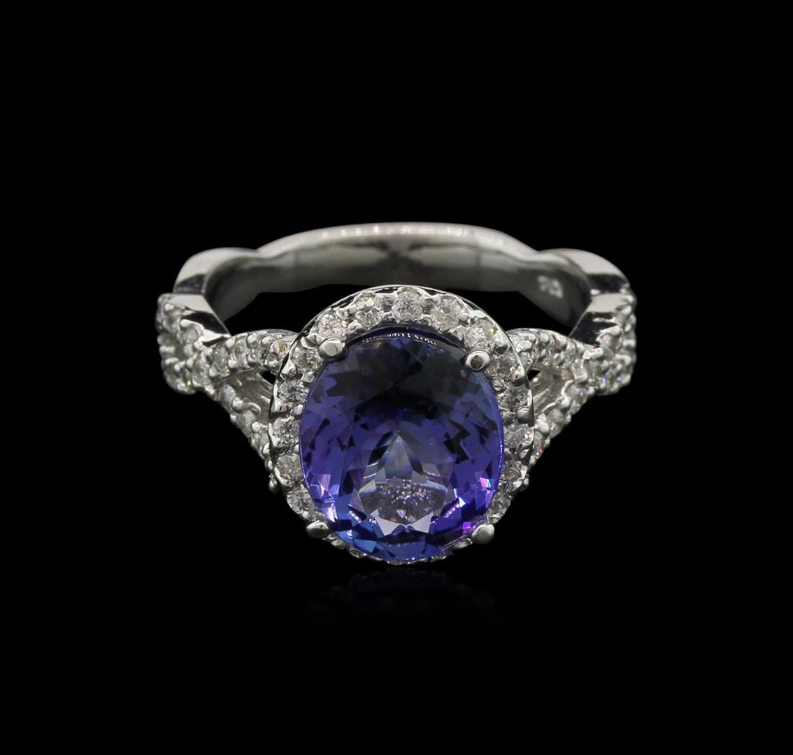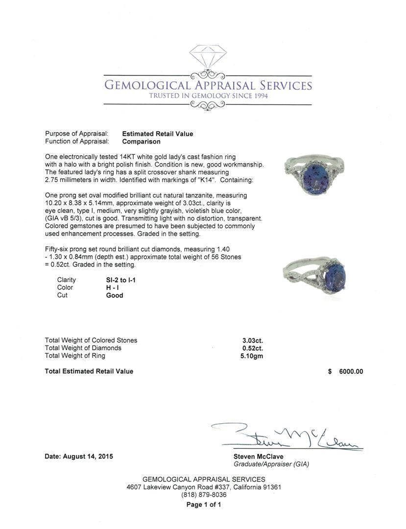 One electronically tested 14KT white gold lady's cast fashion ring with a halo with a bright polish finish. The featured lady's ring has a split crossover shank measuring 2.75 millimeters in width. Identified with markings of "K14". Condition is new, good workmanship. Containing: One prong set oval modified brilliant cut natural tanzanite, measuring 10.20 x 8.38 x 5.14mm, approximate weight of 3.03ct., clarity is eye clean, type I, medium, very slightly grayish, violetish blue color, (GIA vB 5/3), cut is good. Transmitting light with no distortion, transparent. Colored gemstones are presumed to have been subjected to commonly used enhancement processes. Graded in the setting. Fifty-Six prong set round brilliant cut diamonds, measuring 1.40 - 1.30 x 0.84mm (depth est.) approximate total weight of 56 Stones = 0.52ct. Graded in the setting. Clarity: SI-2 to I-1. Color: H - I. Cut Good. Total Weight of Colored Stones 3.03ct. Total Weight of Diamonds 0.52ct. Total Weight of Ring 5.10gm. GAS Appraised at $6,000.00.